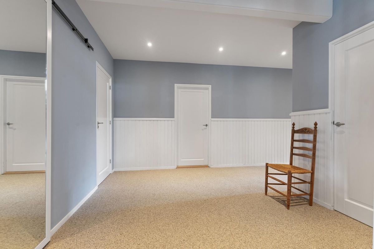 Op de begane grond bevindt zich de master bedroom. Grote ramen zorgen voor veel lichtinval en een fraai uitzicht op de tuin. Vanuit de 1e slaapkamer, die momenteel is ingericht als inloopkast en volop ruimte biedt voor kleding en accessoires, loop je door naar de master bedroom. De badkamer is luxe ingericht met een vrijstaand ligbad, inloopdouche met regendouche, dubbele wastafel en hoogwaardige afwerking in grijs, zwart en hout. Doordat de belangrijkste voorzieningen gelijkvloers aanwezig zijn, is de woning ook levensloopbestendig.