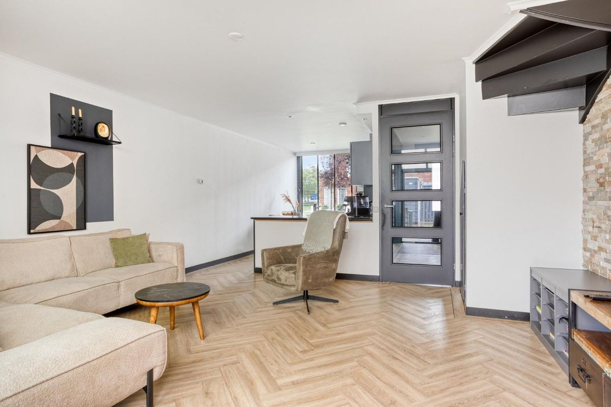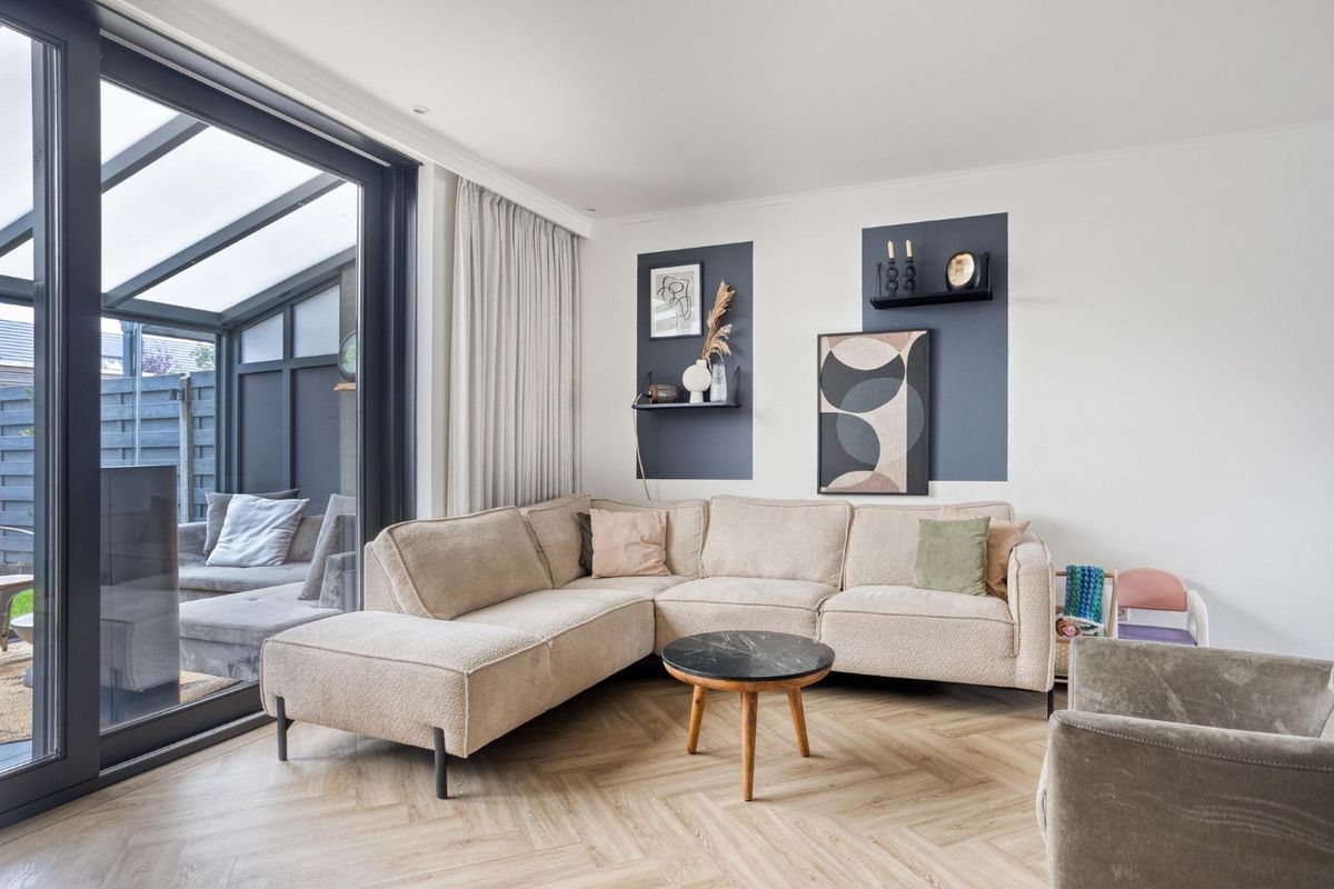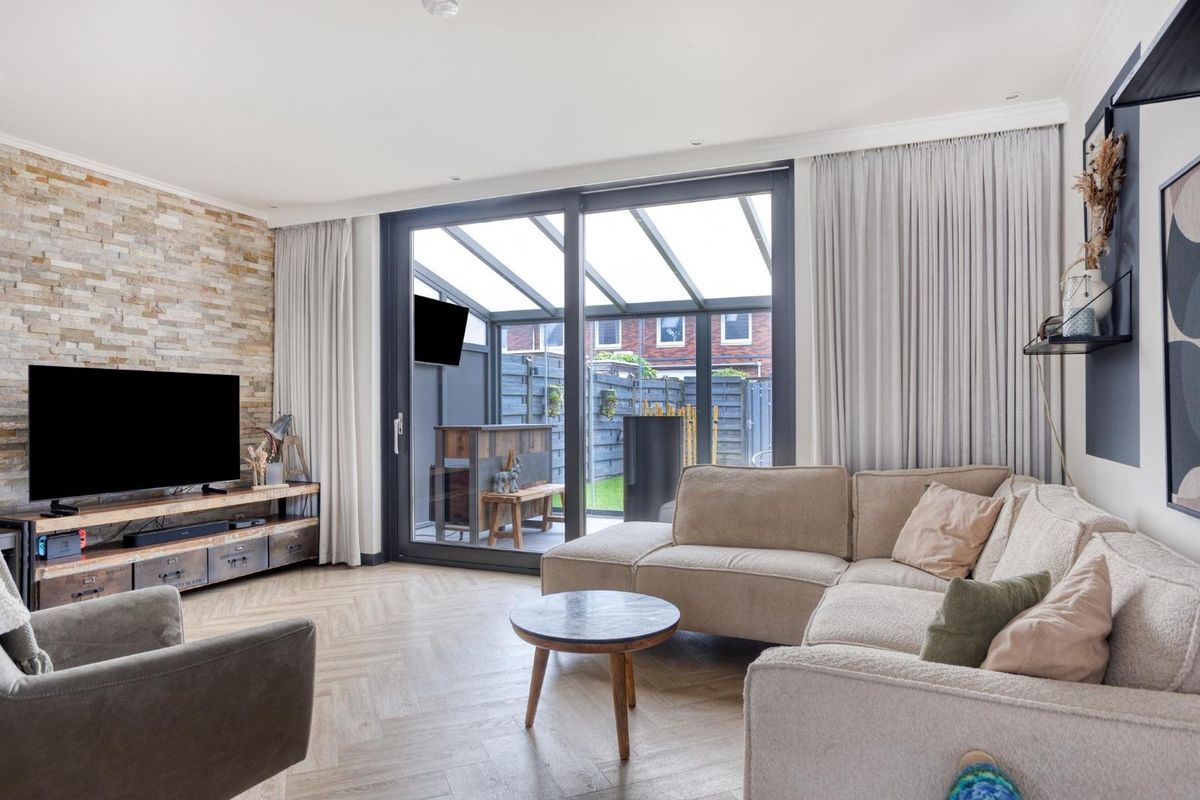 De woonkamer is een prettige ruimte met veel lichtinval dankzij de grote raampartijen en de schuifpui aan de achterzijde.