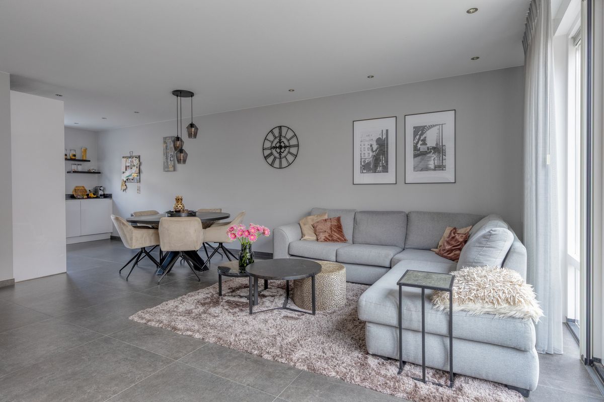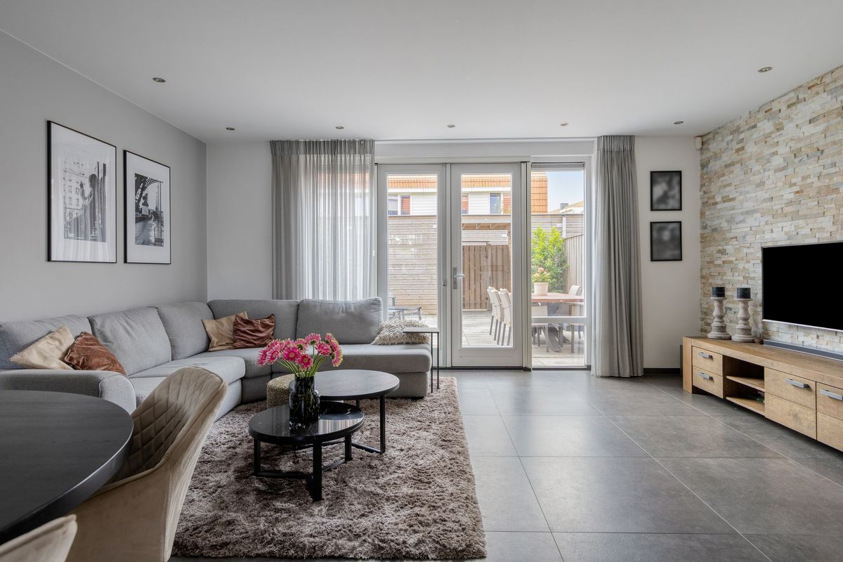 De woonkamer is voorzien van een praktische trapkast en heeft aan de achterzijde een groot raampartij met openslaande deuren naar de zonnige achtertuin.
