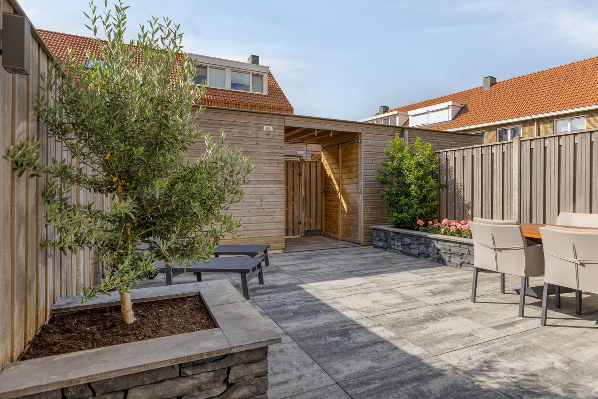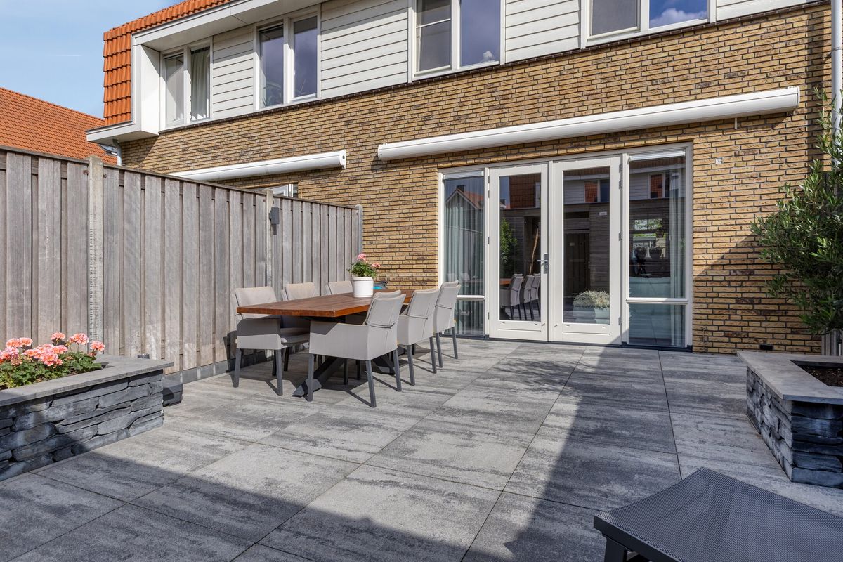 De verzorgde zonnige achtertuin is onderhoudsvrij aangelegd, voorzien van diverse plantenborders en bestraat met een groot formaat grijze tegel. De tuin beschikt over een vrijstaande houten berging met overkapping en een achterom.