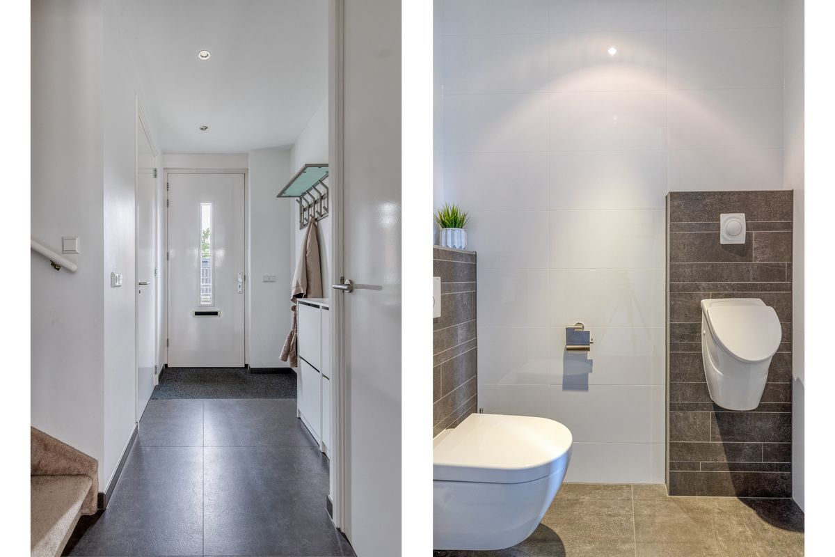 Na de verzorgde voorzijde volgt de entree van de woning. De hal is voorzien van een meterkast, moderne toiletruimte met wandcloset, fonteintje en urinoir en de trap naar de eerste verdieping. Daarna volgt de woonkamer met luxe open keuken. De moderne keuken is gesitueerd aan de voorzijde en is uitgerust met de volgende inbouwapparatuur: inductiekookplaat, afzuigkap, combi-oven, koel-vriescombinatie en Quooker.