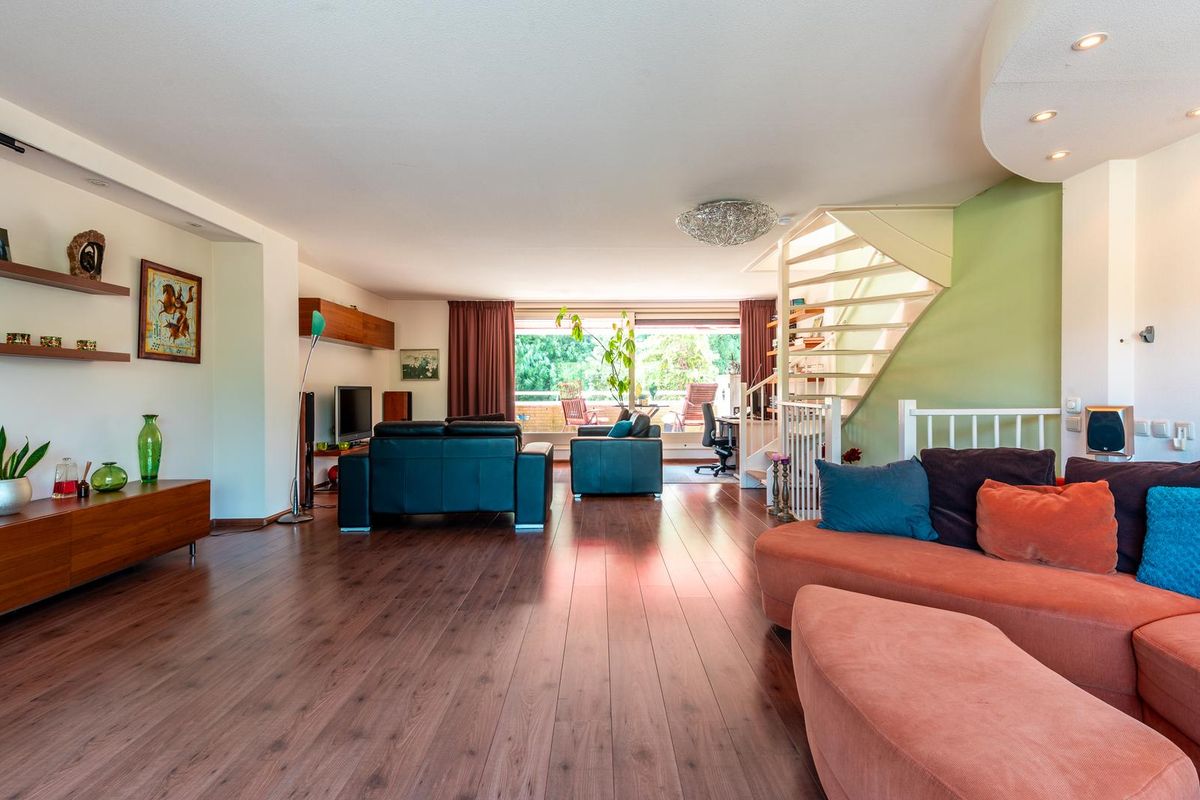 Uniek aan deze woning is de gigantische woonkamer van circa 60m² op de eerste verdieping. Een zeldzame ruimte, met grote raampartijen en fantastisch vrij uitzicht over het bos. Via de schuifpui bereik je het ruime dakterras, ook op het zuidwesten. Het zonnescherm zorgt ervoor dat je hier comfortabel zit, in zon of schaduw. *Deze ruimte is eenvoudige op te delen in tweeën. Hierbij creëert u een slaapkamer extra en houdt u voldoende ruimte over voor een ruime woonkamer (tussen de foto's hebben wij als optie, een extra slaapkamer toegevoegd).