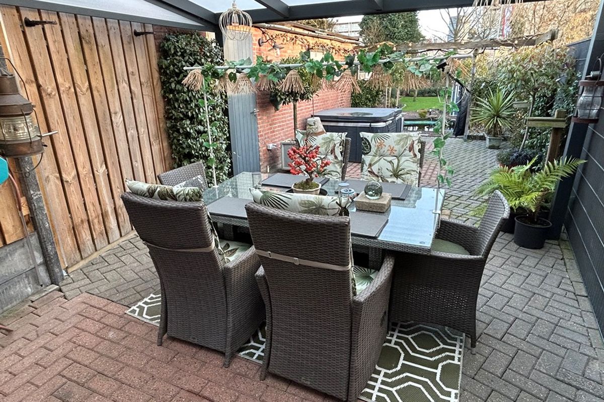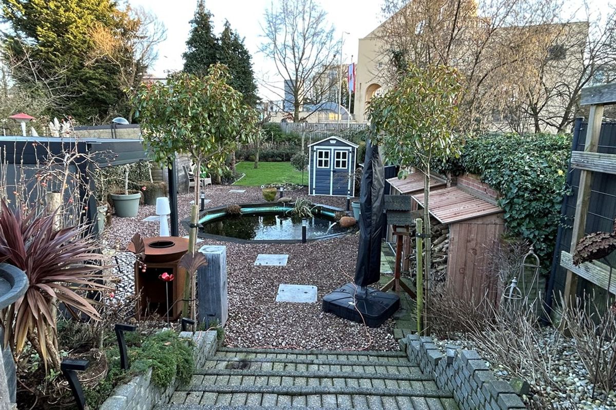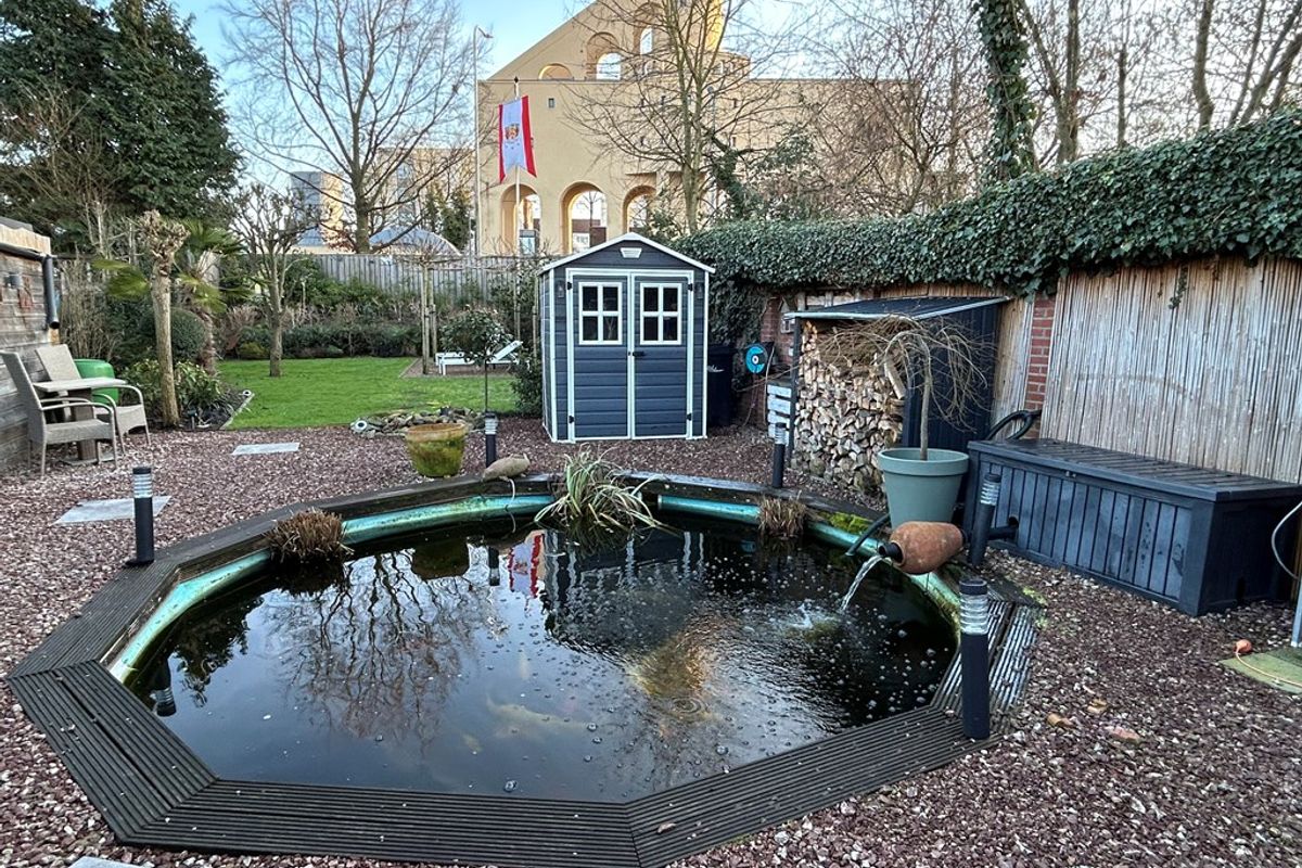 Achtertuin met terras met overkapping 4,10 x 3,80 met verlichting, gazon, vijver, bestrating, beplanting, houten schuttingen, kraan, elektriciteit en geweldig uitzicht op de schacht van Nulland.