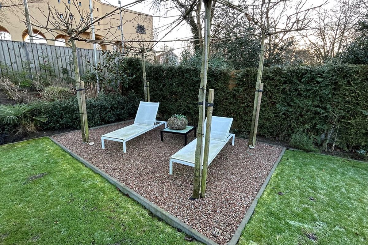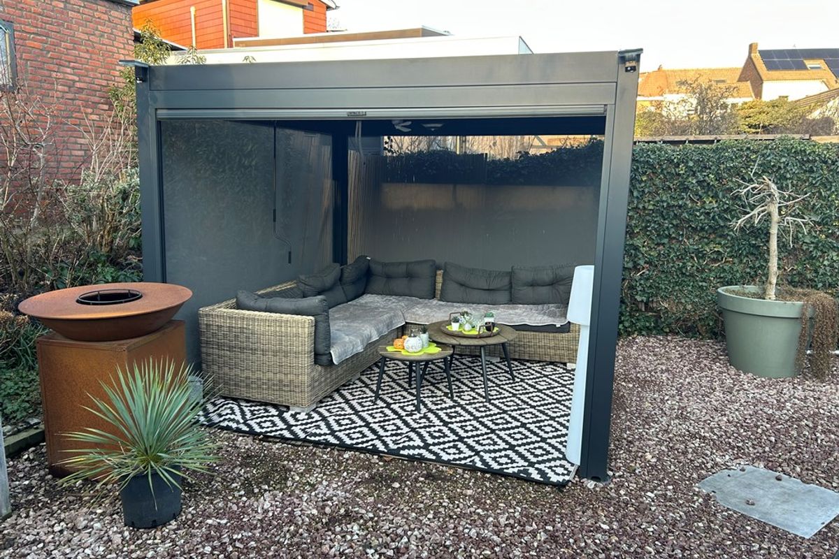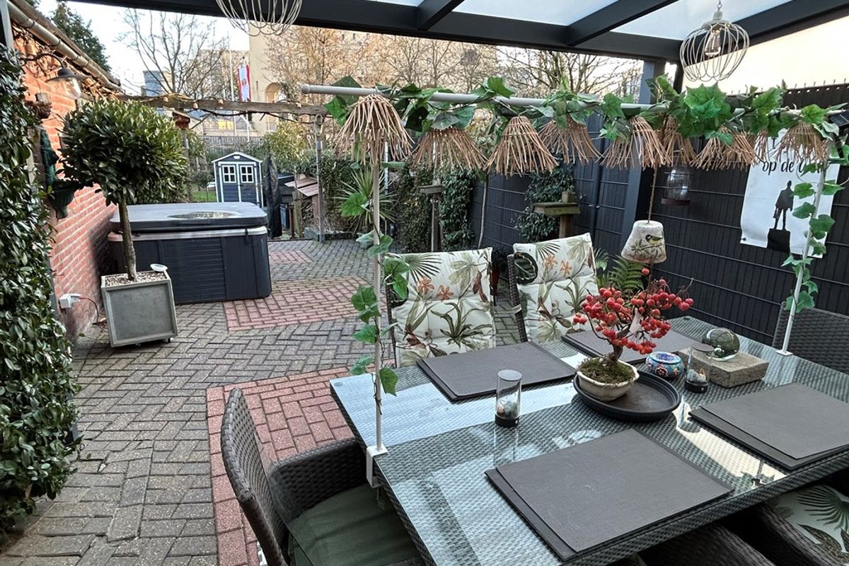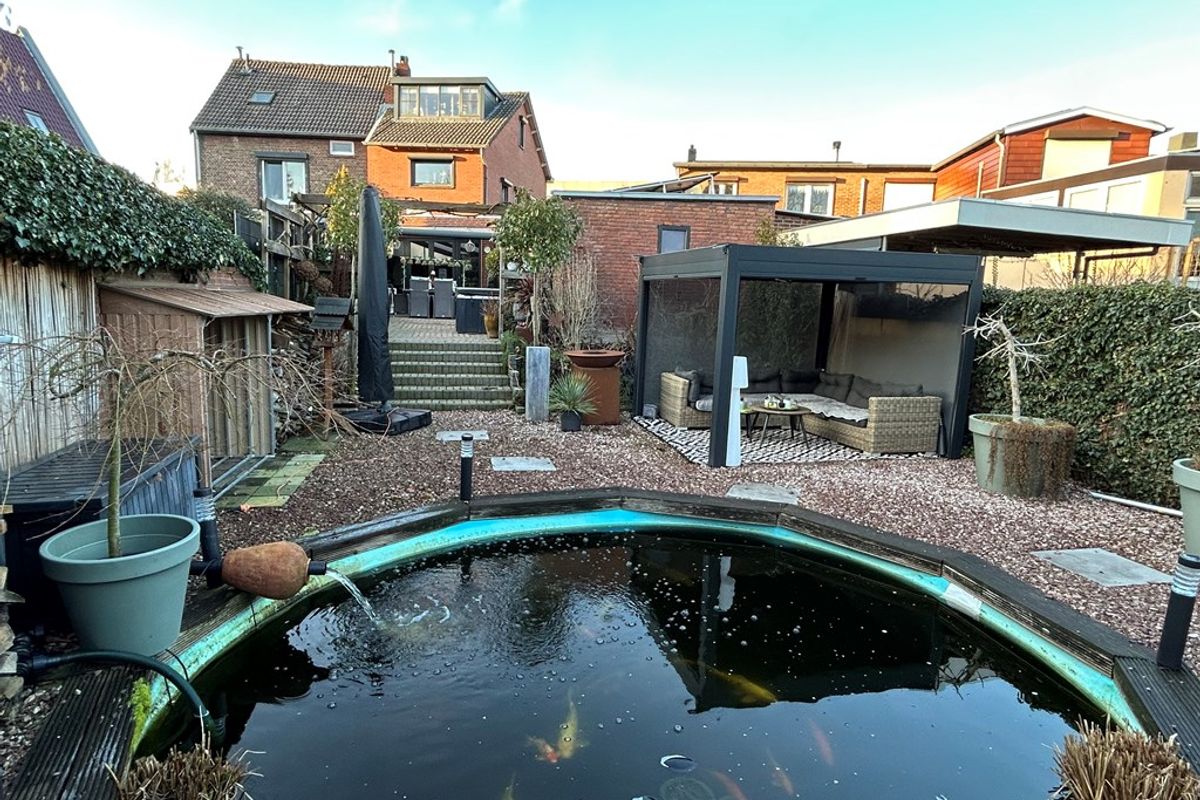 Achtertuin met terras met overkapping 4,10 x 3,80 met verlichting, gazon, vijver, bestrating, beplanting, houten schuttingen, kraan, elektriciteit en geweldig uitzicht op de schacht van Nulland.