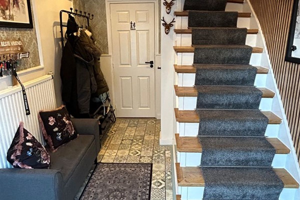 Mooie sfeervolle entree/hal 4,00 x 2,40 met laminaatvloer, inbouwspots, nieuwe meterkast met slimme stroommeter, deur naar woonkamer, keuken en gastentoilet en trap naar verdieping.