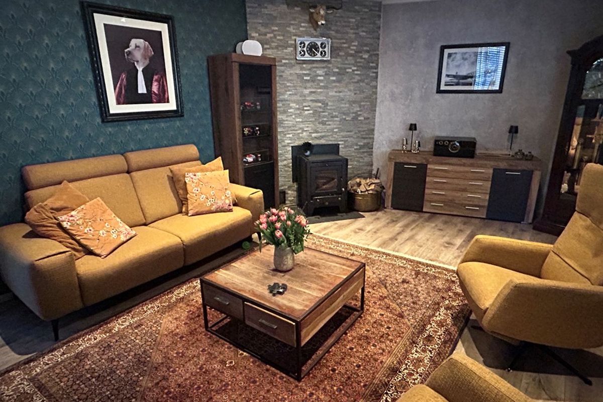 Woonkamer 6,15 x 4,00 met laminaatvloer, inbouwspots en houtkachel (ter overname).
