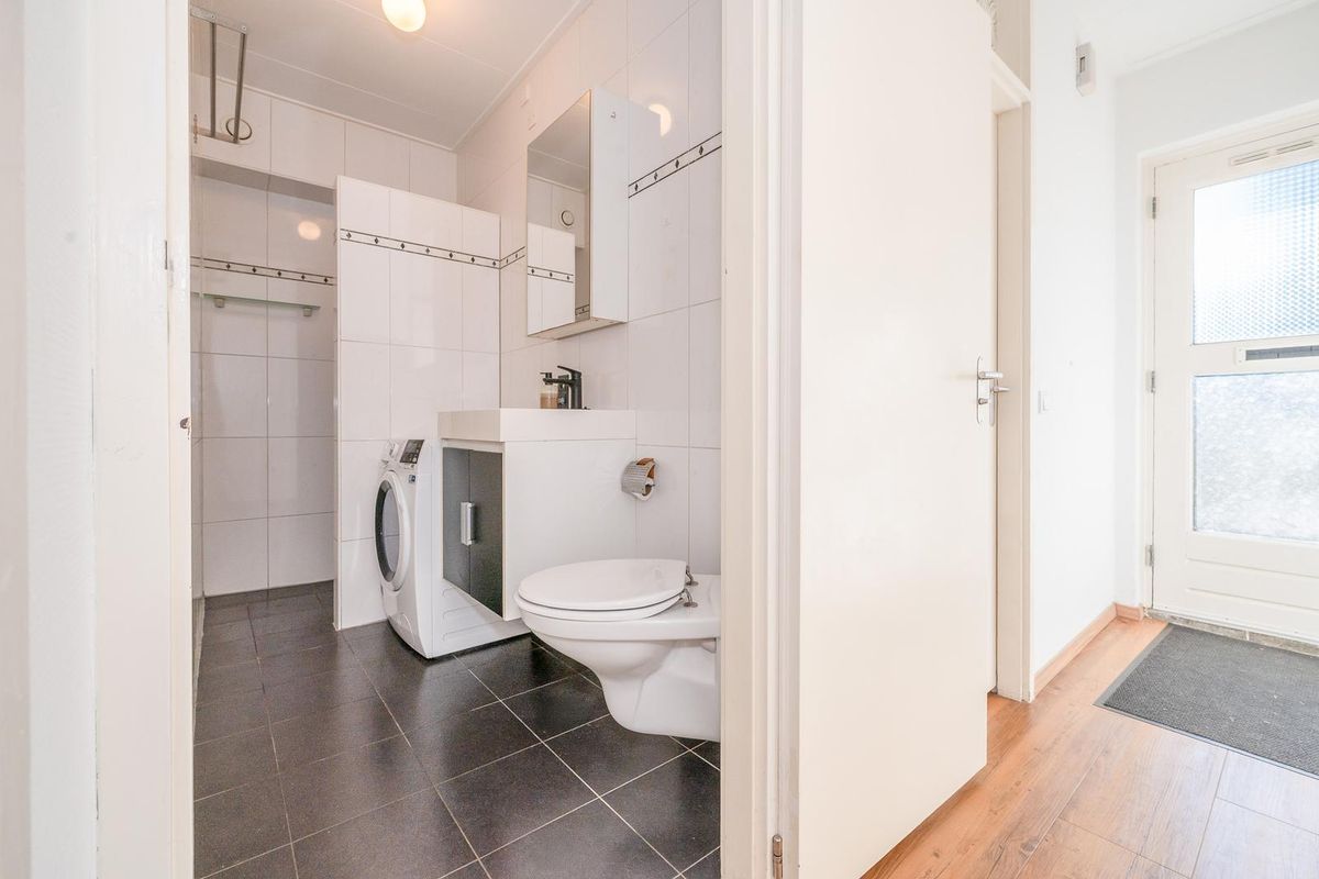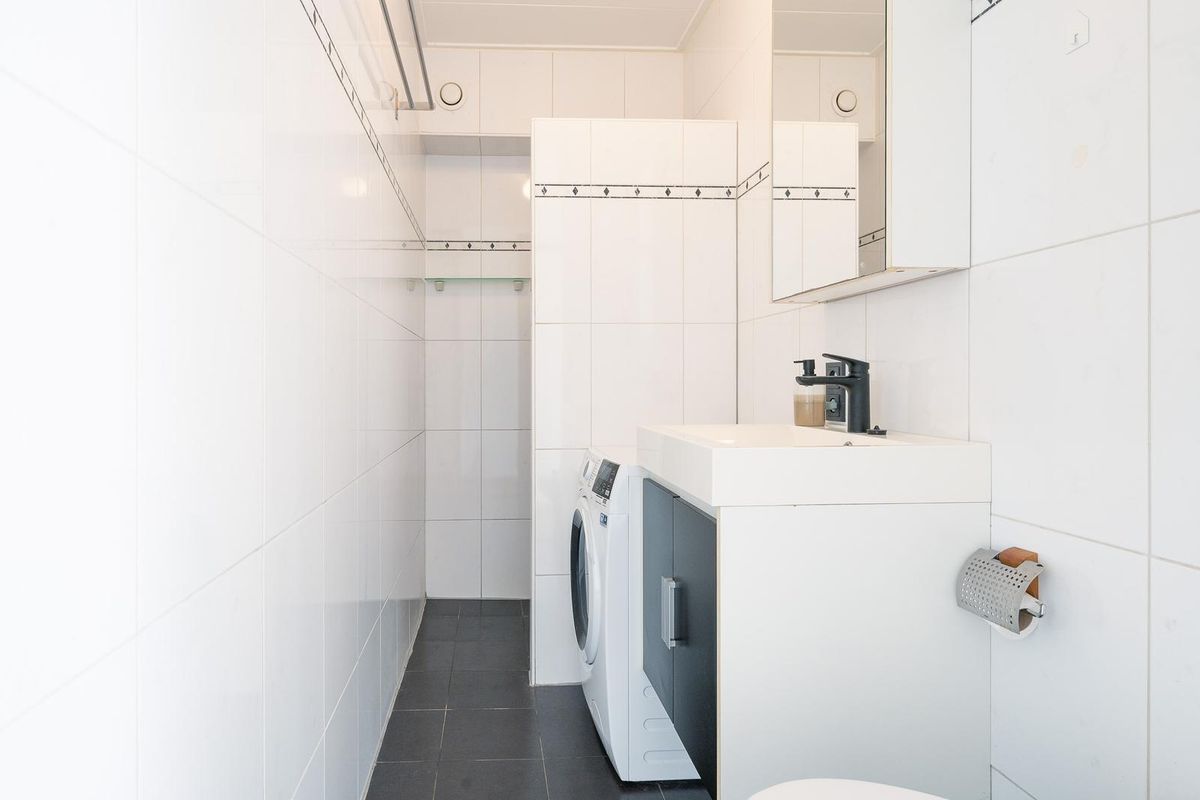 De badkamer is volledig betegeld en voorzien van toilet, wastafelmeubel, douche en wasmachineaansluiting.