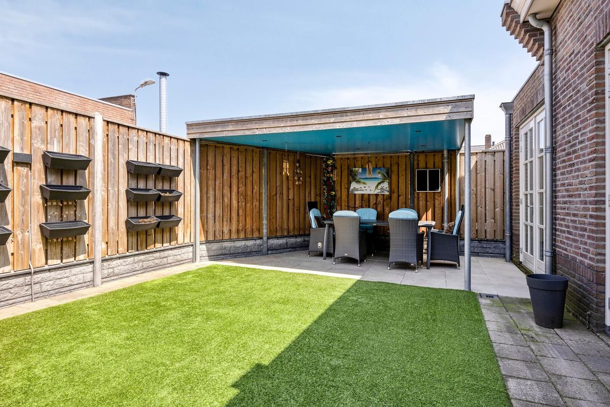 Via een toegangsdeur in de garage of in de living bereikt u de achtertuin van de woning. De tuin is voorzien van een terras met overkapping, voorzien van inbouwspots, en kunstgras.