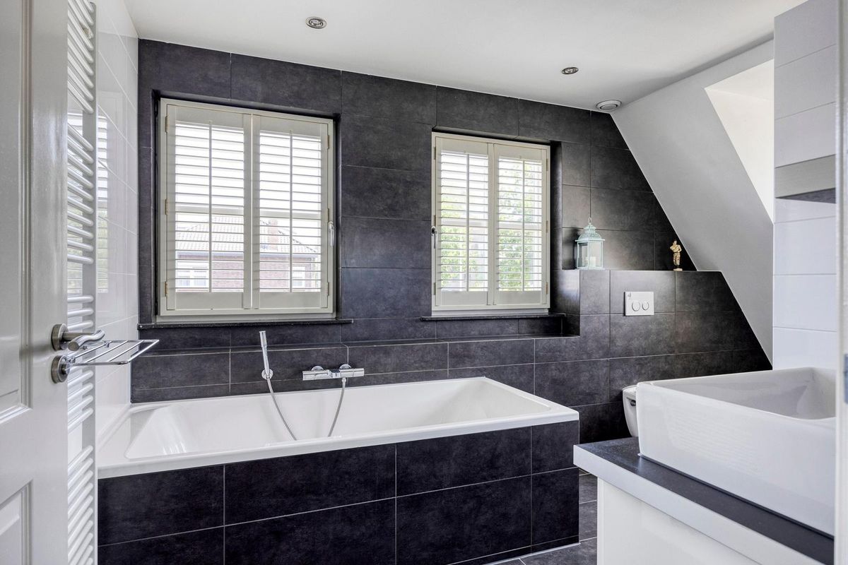 De volledig betegelde badkamer is voorzien van een ligbad, inloopdouche, wandcloset en een wastafelmeubel.