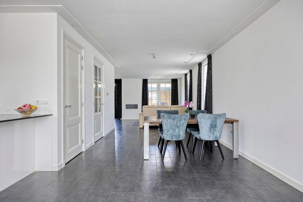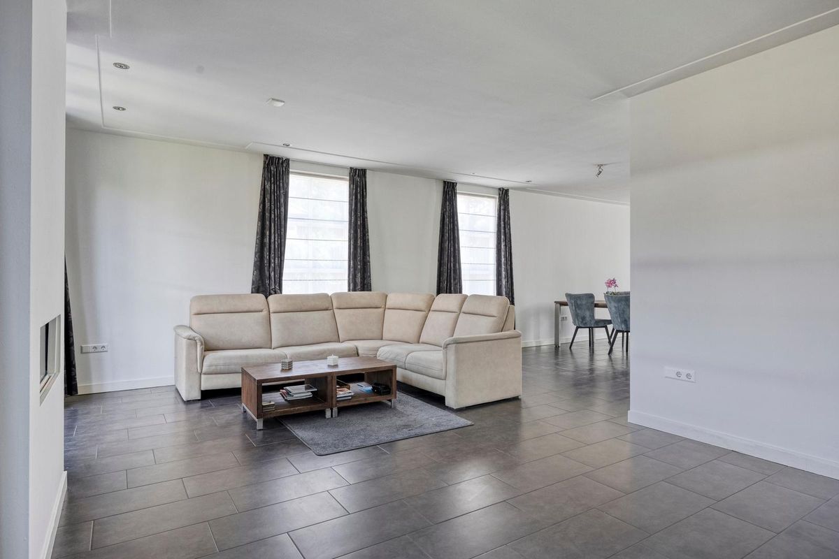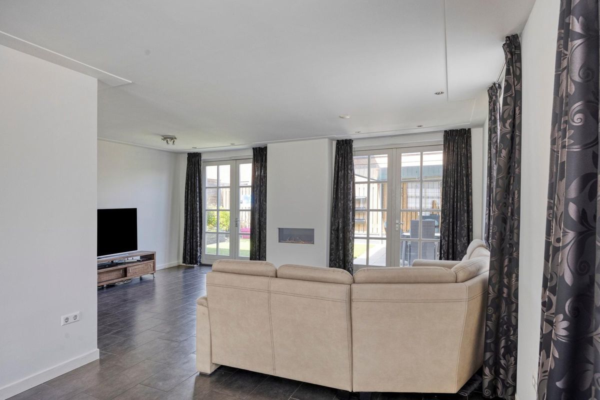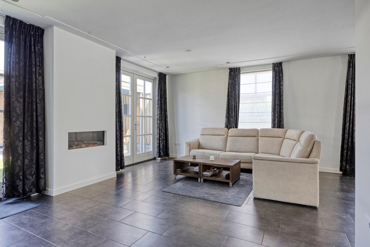 De living geniet dankzij grote raampartijen aan de voor- en achterzijde van de woning van veel daglicht. Deze ruimte is voorzien van een stenen vloer en een gashaard.