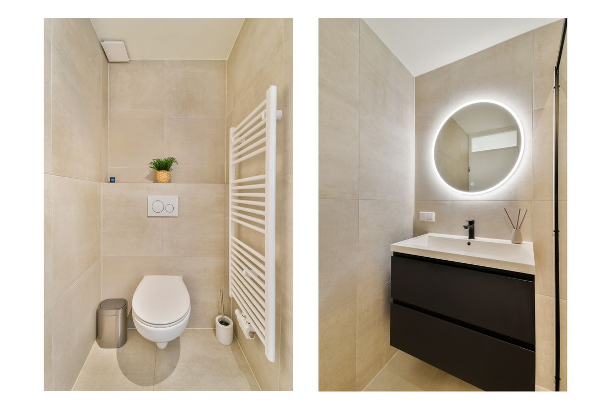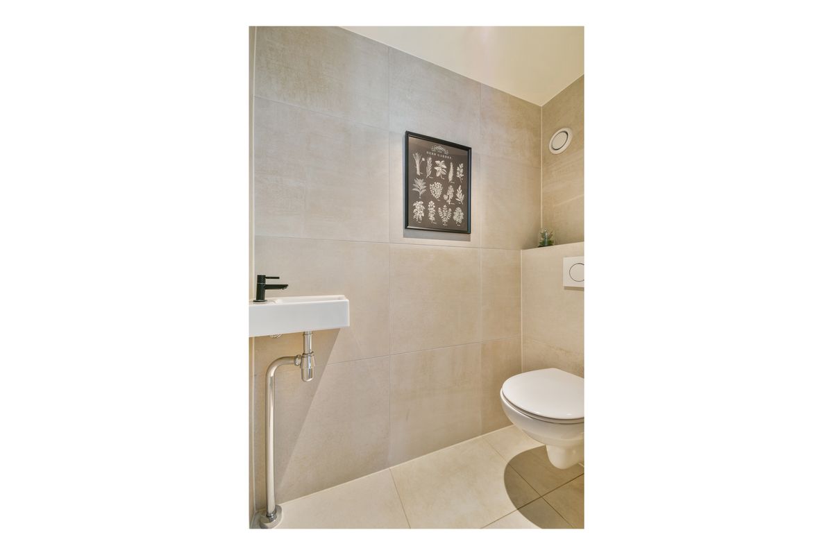 De eerste verdieping vormt de centrale leefverdieping. Hier vindt u een lichte woonkamer met grote raampartijen, waardoor er veel daglicht binnenkomt. De moderne keuken is praktisch ingericht met inductiekookplaat, oven, combimagnetron, mengkraan, vaatwasser, afzuigkap en koelvriescombinatie en sluit mooi aan op het eetgedeelte. Aan de achterzijde grenst de woonkamer aan een balkon waar u in alle rust kunt genieten van de buitenlucht. Ook op deze verdieping bevindt zich een separaat toilet, handig en comfortabel voor dagelijks gebruik.