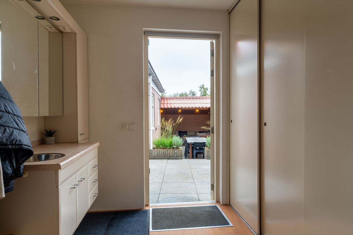 De voortuin is praktisch ingedeeld met sierbestrating en grindborder met vaste beplanting. De oprit voor de garage met bergzolder (8.00 x 3.74 meter) en elektrische deur, biedt parkeerplek voor meerdere auto’s en de omsloten achtertuin met berging en sfeervolle veranda is gelegen op het noorden. Via een trap is er een tweede toegang tot het leuke dakterras.