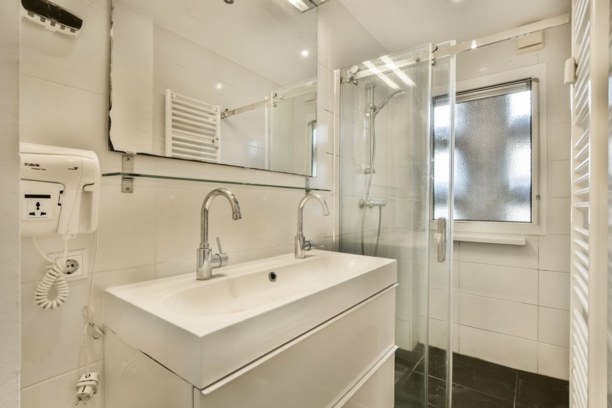 De badkamer is voorzien van een inloopdouche, toilet, wastafel en aansluiting voor de wasmachine.