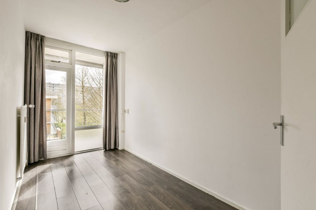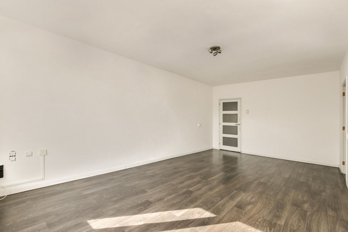 De lichte woonkamer biedt uitzicht op de groene omgeving en geeft toegang tot de balkon. De gesloten keuken is functioneel ingericht en bevindt zich aan de voorkant van het appartement.