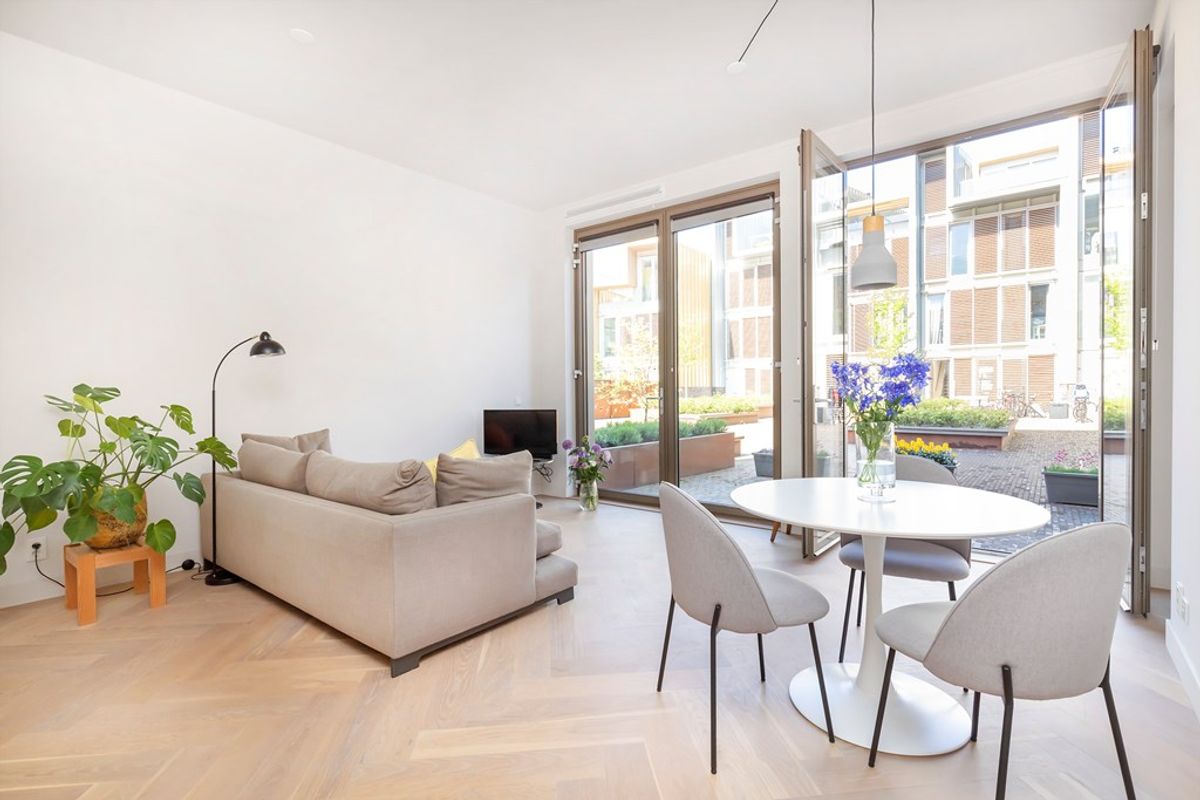 De woonkamer is opvallend licht dankzij de grote raampartijen en biedt een prettig leefklimaat. Vanuit de woonkamer heb je direct toegang tot de privé buitenruimte, gelegen in de rustige binnentuin die uitsluitend toegankelijk is voor bewoners. Een heerlijke plek om buiten te zitten in alle rust.