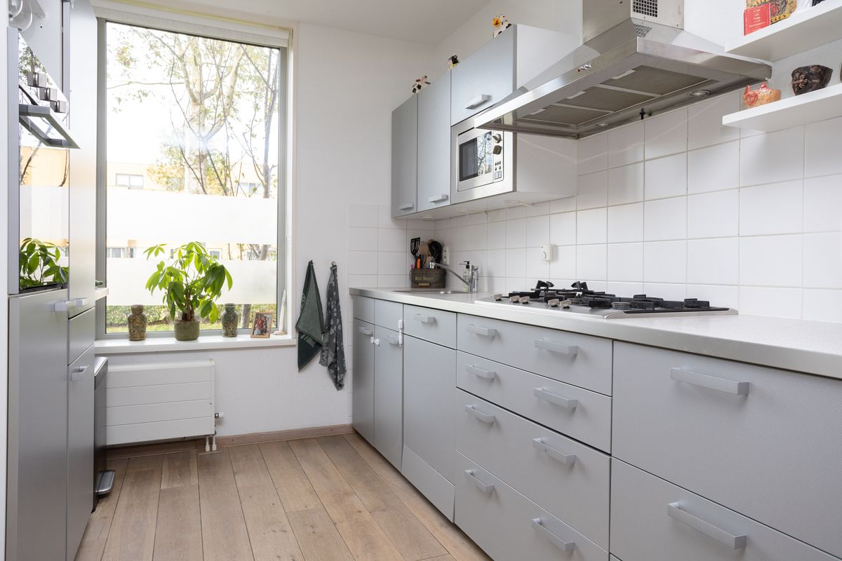 Entree woning; toilet met fonteintje, meterkast en deur naar de royale living. Wat direct opvalt zijn de prachtige raampartijen; heerlijk al dat licht. Aan de voorzijde is de open keuken en deze is voorzien van alle gemakken. Gaskookplaat, oven, magnetron, koelkast, vriezer en een vaatwasser. Het geheel is afgewerkt met een kunststof blad. Aan de achterzijde is de tuingerichte woonkamer. De volledige begane grond is voorzien van een laminaatvloer.