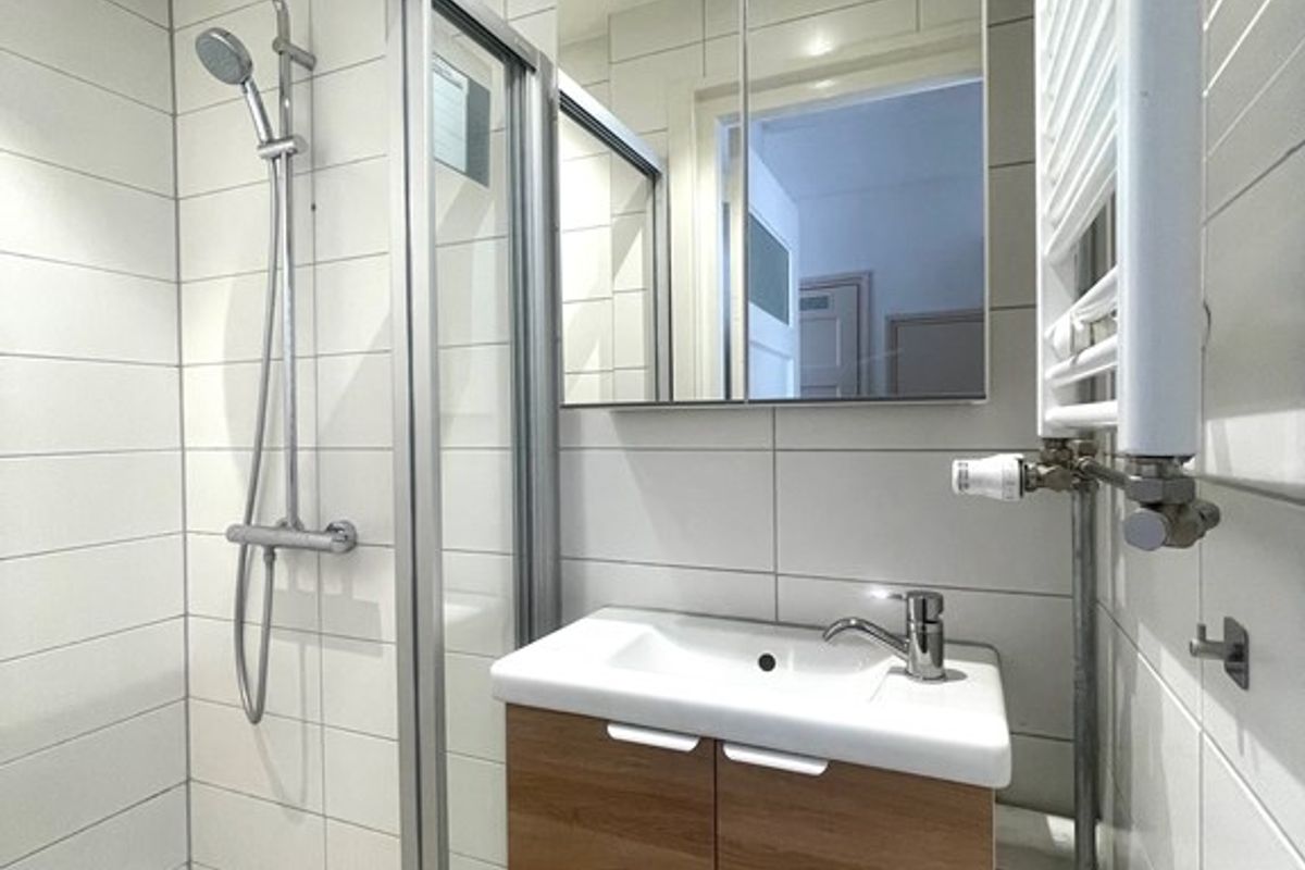 De volledig betegelde badkamer is voorzien van een ruime douche en wastafelmeubel met spiegel.