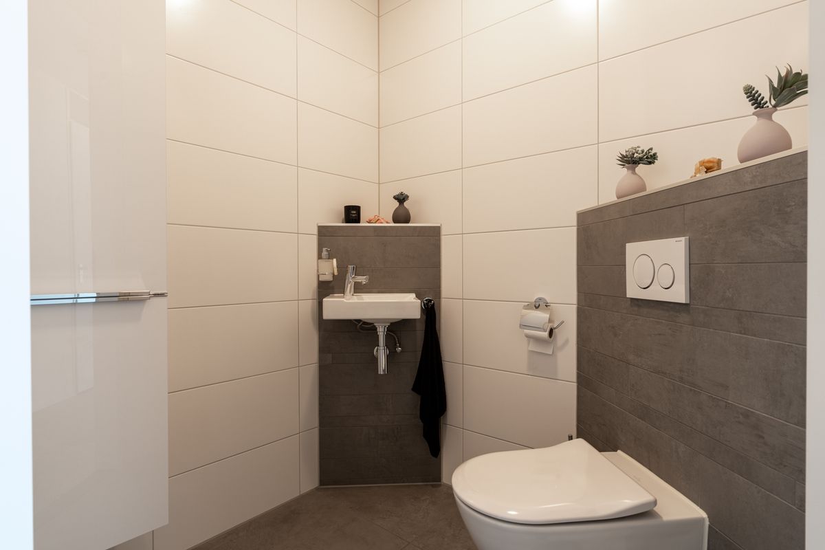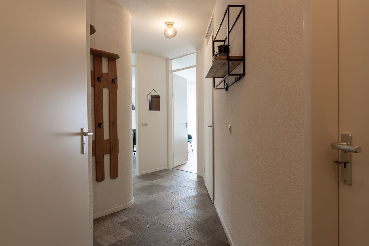 Je komt binnen via de centrale entree beneden. Daarna pak je de trap of lekker makkelijk de lift naar jouw verdieping. Vanuit de hal loop je zo naar de slaapkamers, het toilet, de bijkeuken, de keuken of badkamer. Het toilet is netjes afgewerkt met een zwevend closet en een fonteintje. In de woonkamer zorgen grote ramen voor lekker veel licht en uitzicht – en ze zijn ook nog voorzien van elektrische rolluiken.