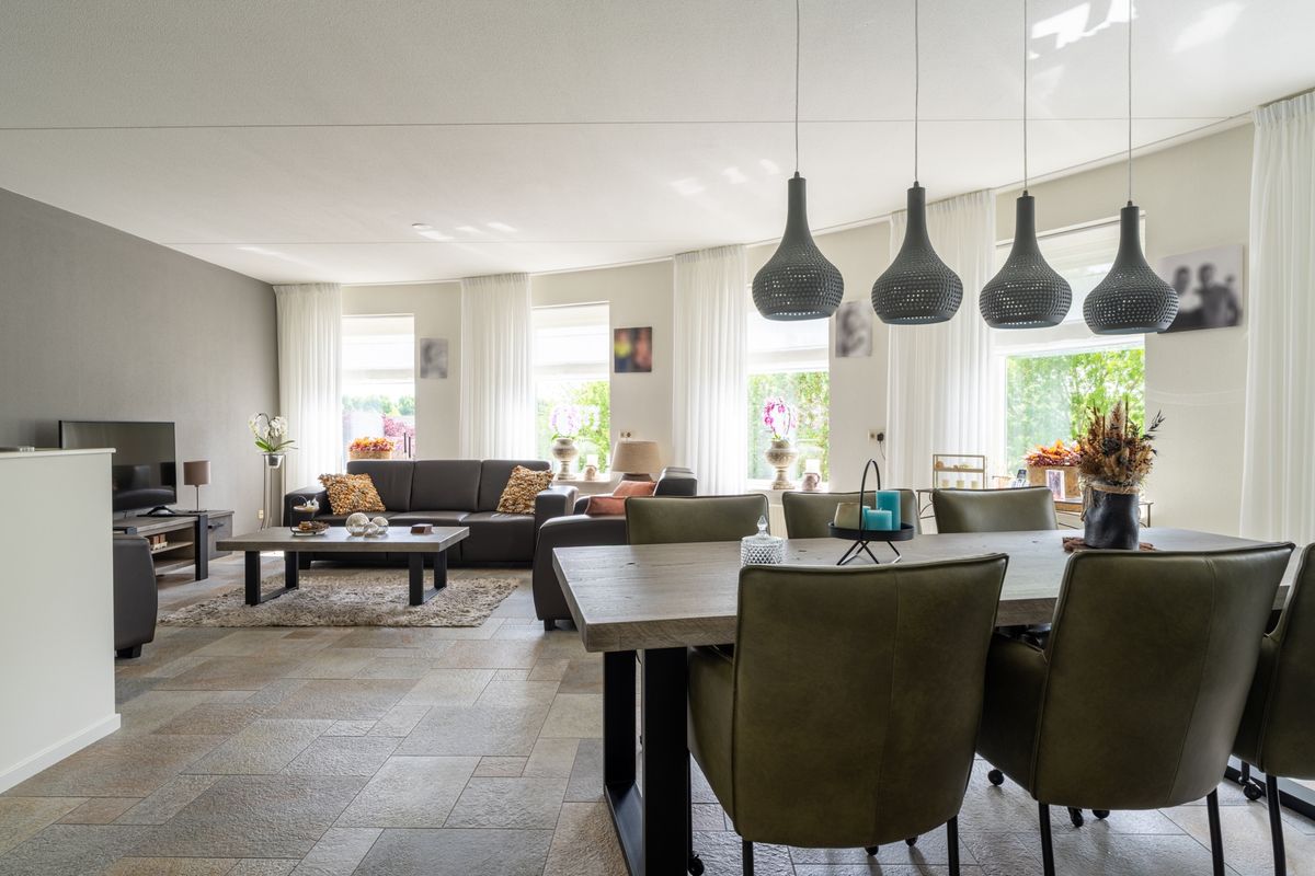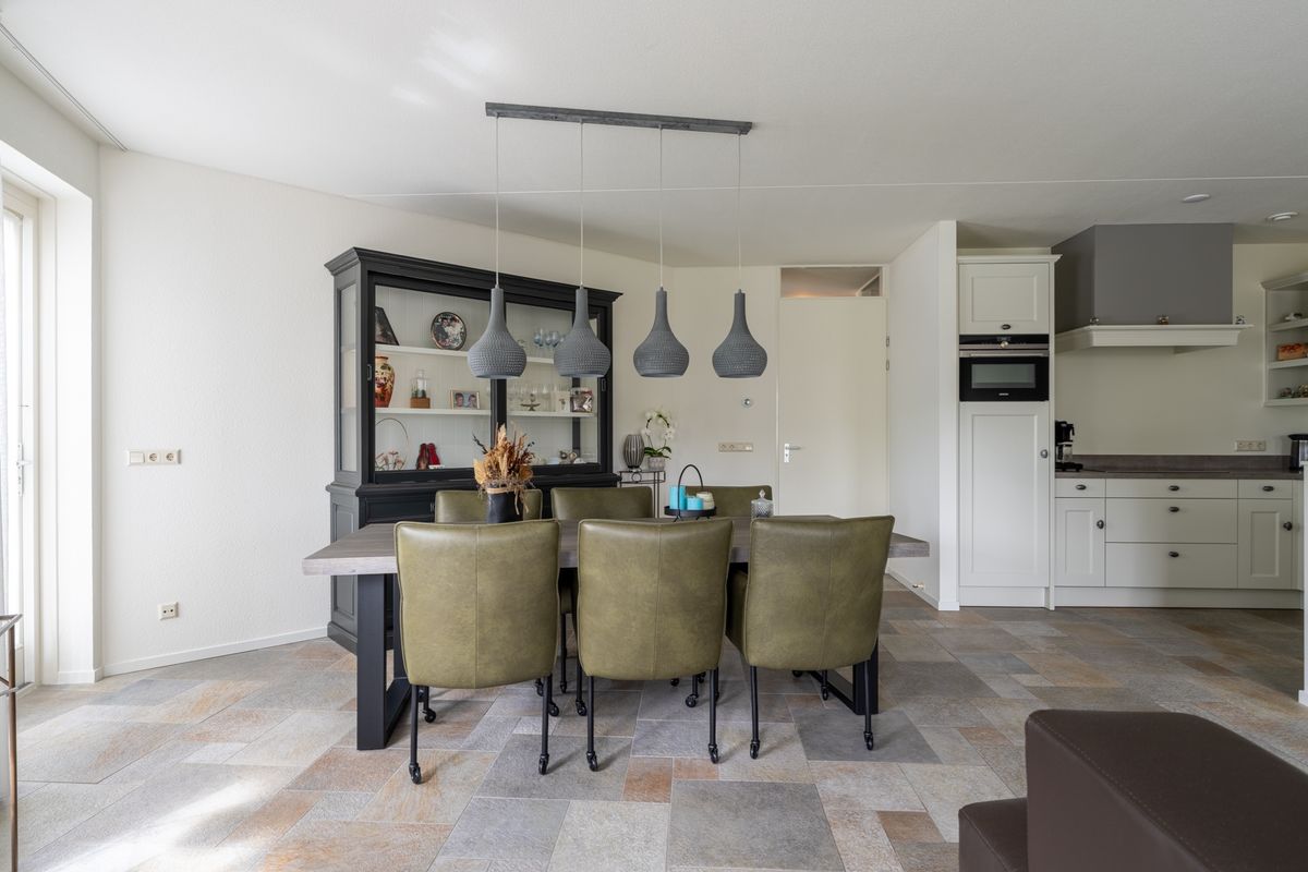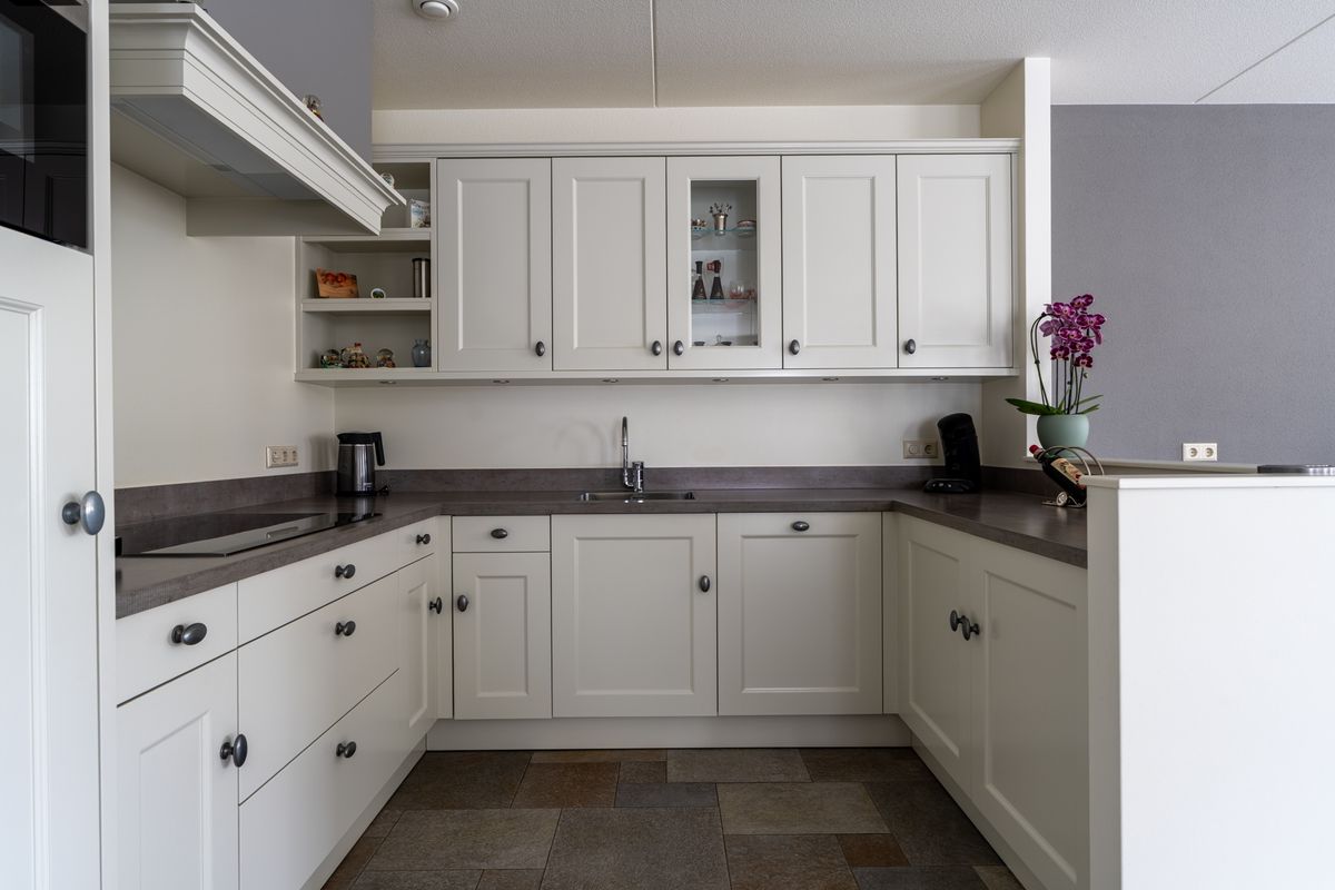 De keuken is echt een blikvanger. Mooie u-vorm, strak stenen werkblad en helemaal compleet met inductiekookplaat, afzuigkap, koelkast, vriezer, combimagnetron én vaatwasser. Door de open indeling sta je tijdens het koken gewoon gezellig in contact met de woonkamer. In de bijkeuken vind je nog extra bergruimte, plus de afzuigunit en cv-ketel.