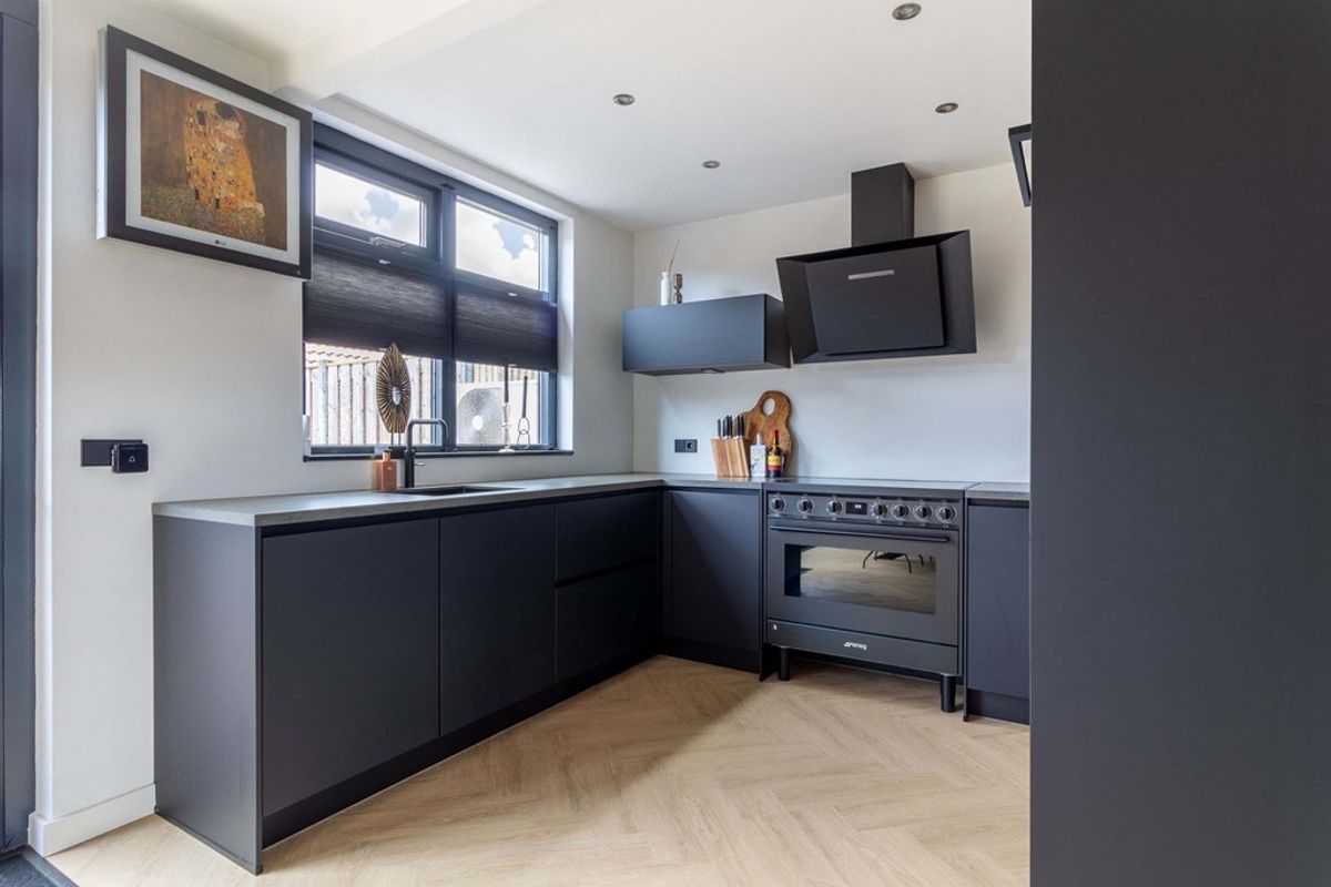 Aan de achterzijde bevindt zich de halfopen keuken in U-opstelling, voorzien van diverse inbouwapparatuur.