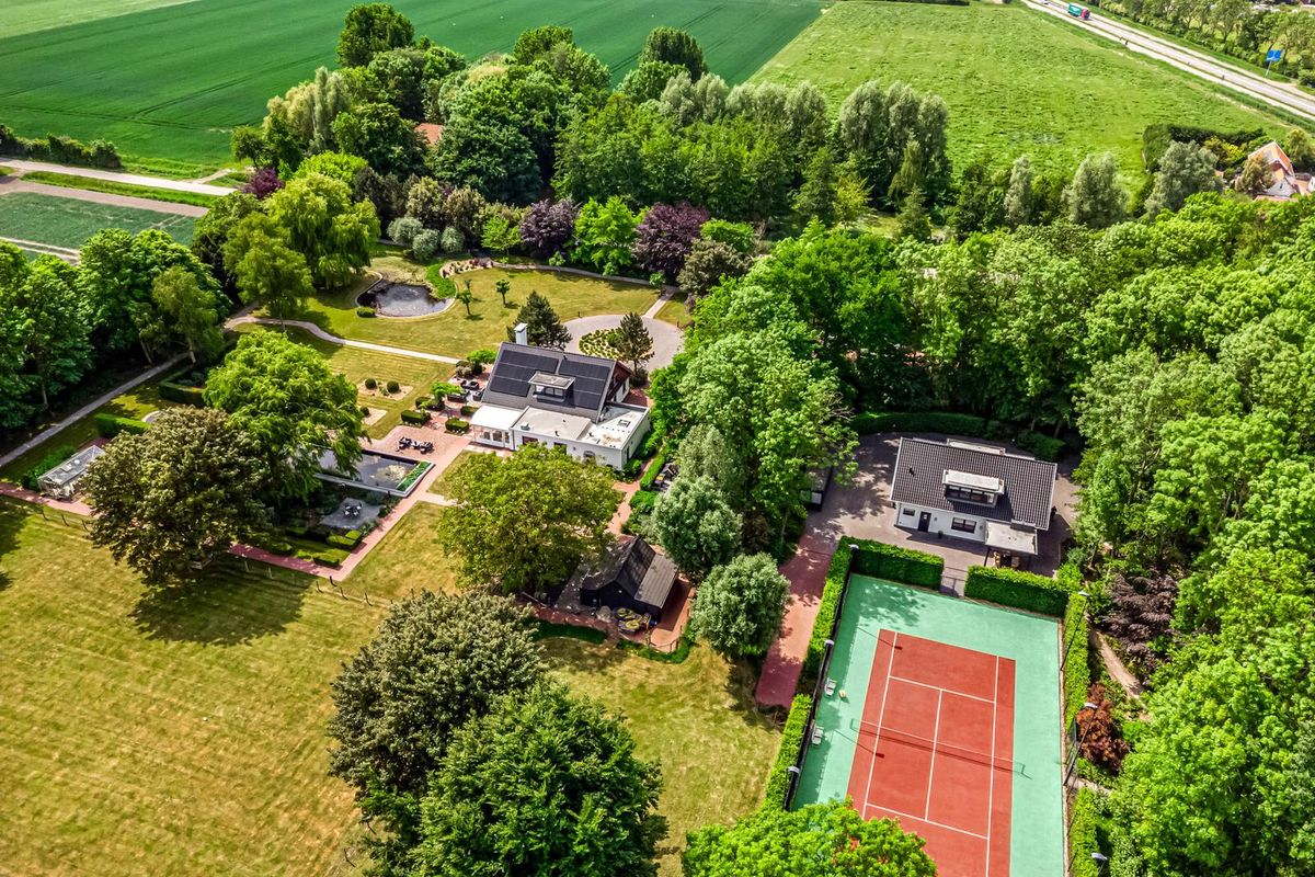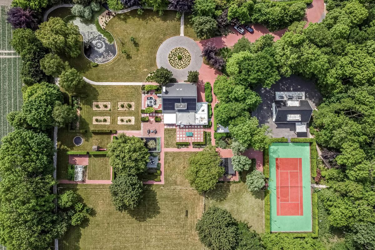 Wat een luxe: direct grenzend aan het bijgebouw vindt u een stijlvol overdekt terras, waar u onder het genot van een drankje kunt nagenieten van een sportieve uitdaging. Vanaf deze fijne plek kijkt u uit over de eigen privétennisbaan, die als vanzelfsprekend in het groene landschap is opgenomen. Of u nu recreatief een balletje slaat of fanatiek traint – deze fraaie baan biedt op elk moment van de dag ruimte voor beweging en ontspanning. En wilt u in de avond nog een wedstrijdje spelen? Dankzij de geïntegreerde baanverlichting is ook dat mogelijk. Hier komen comfort, buitenleven en sport samen. De tennisbaan is niet alleen een unieke voorziening, maar ook een verlengstuk van de luxe levensstijl die deze plek zo bijzonder maakt.