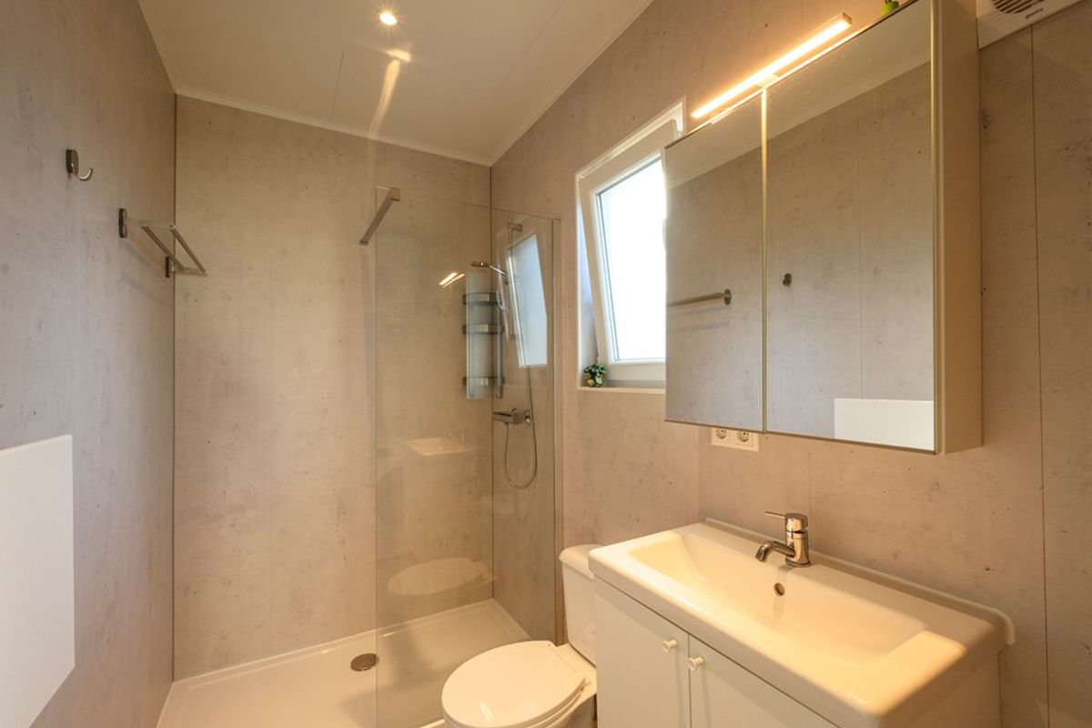De moderne badkamer is luxe afgewerkt en voorzien van een ruime douche, toilet en een wasmachine. De wasmachine is geplaatst in een nis naast de deur, blijft achter bij oplevering en is uit 2024, waardoor er nog garantie op zit.