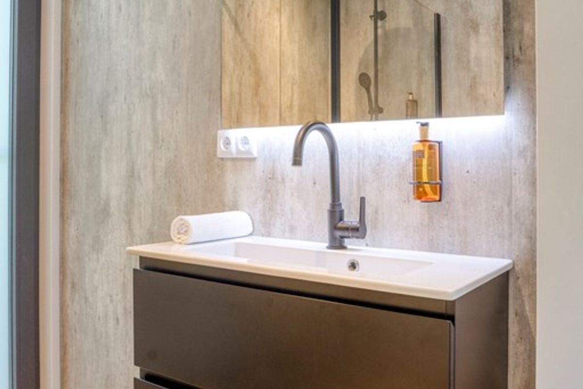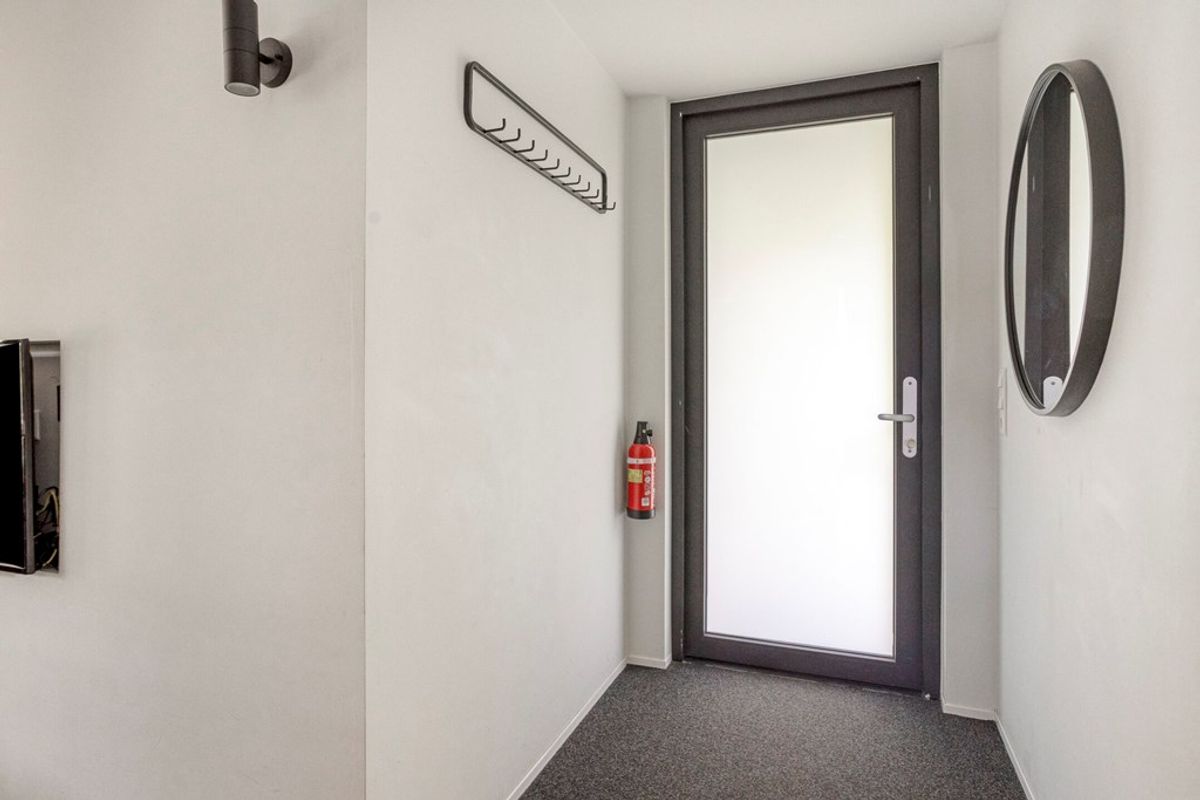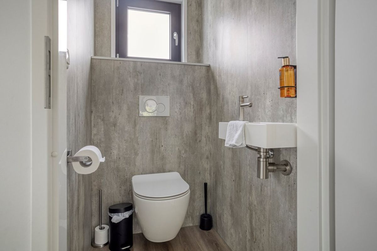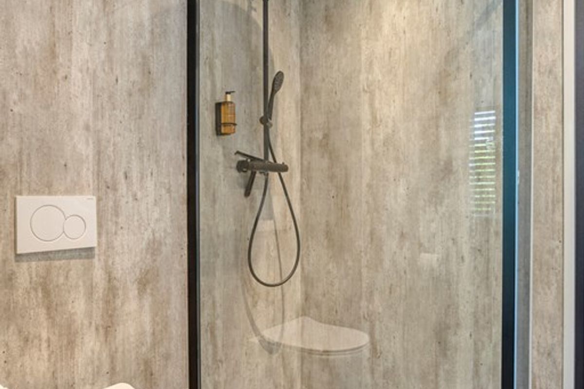De badkamer is eigentijds ingericht met een ruime douche met glazen scheidingswand, zwevend toilet en een wastafelmeubel met opbergruimte. De moderne faciliteiten en strakke afwerking creëert een prettige, ontspannen sfeer. Daarnaast is er een apart toilet aanwezig.
