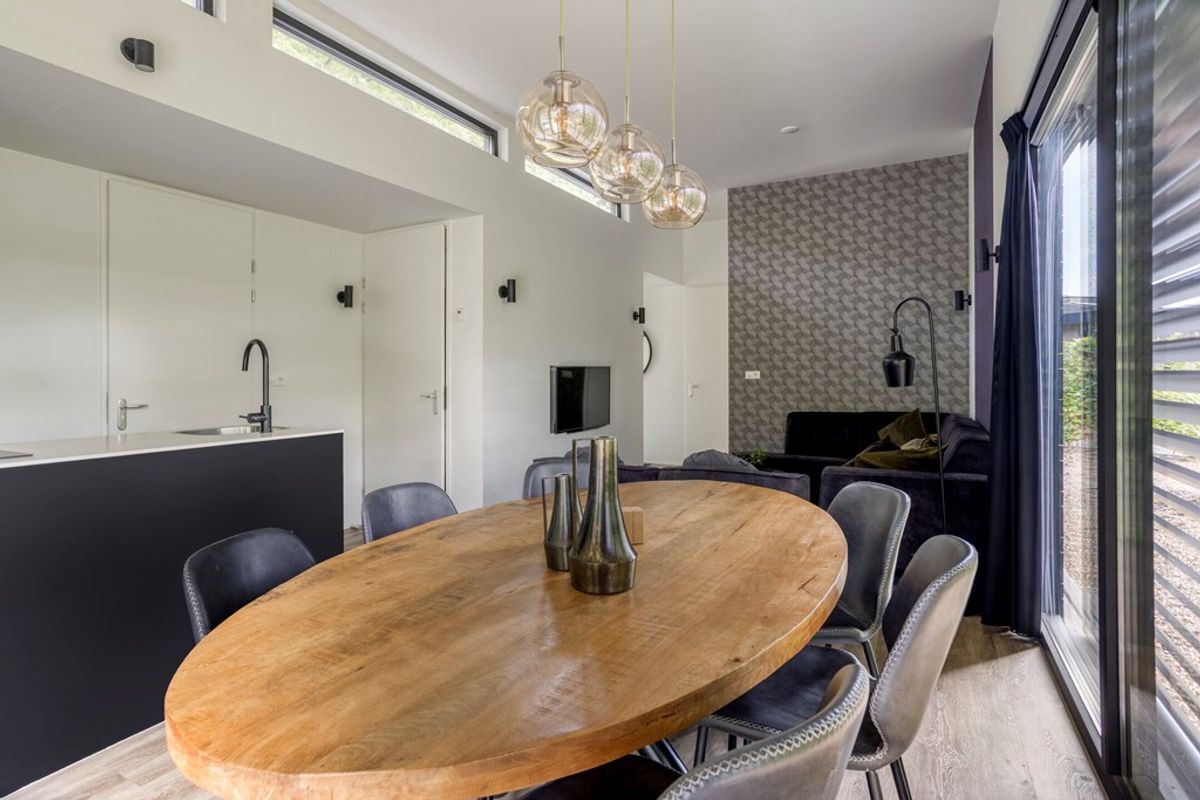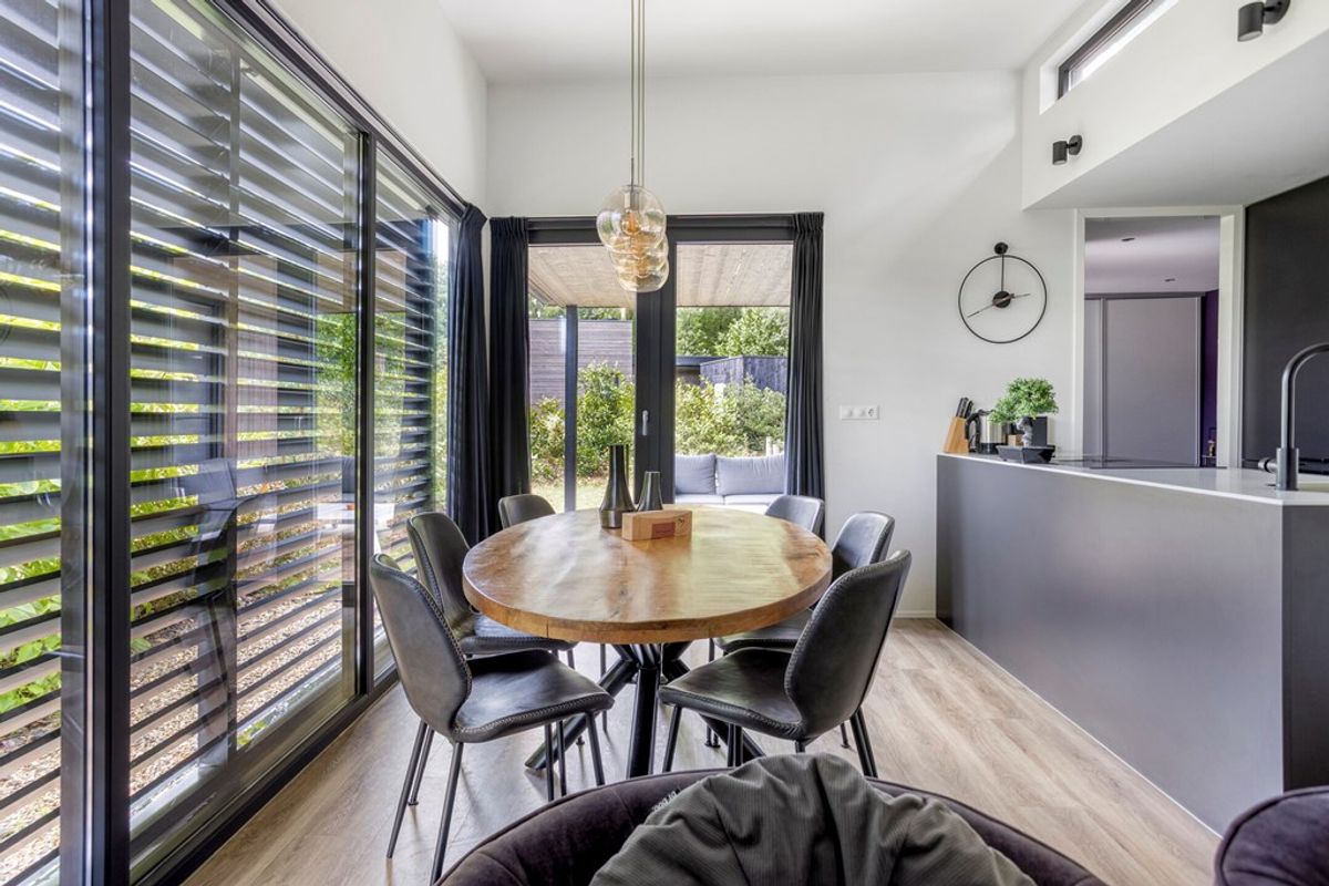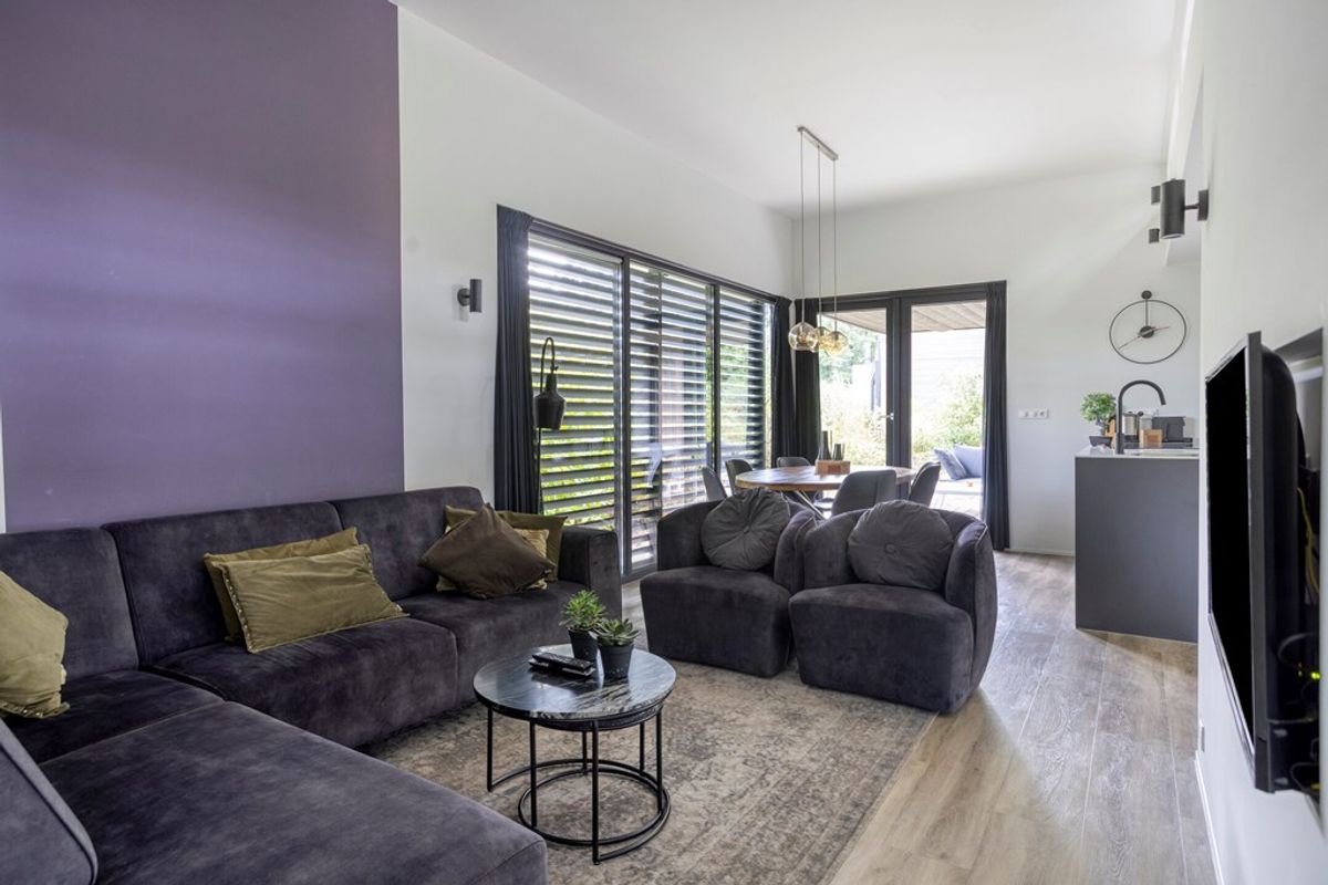 De woonkamer is ruimtelijk en licht, met grote raampartijen die uitzicht bieden op de omringende tuin. De indeling maakt het eenvoudig om een gezellige zithoek en een eetgedeelte te combineren. Via de openslaande deuren loopt u direct door naar buiten, waardoor het binnen- en buitenleven naadloos in elkaar overlopen.