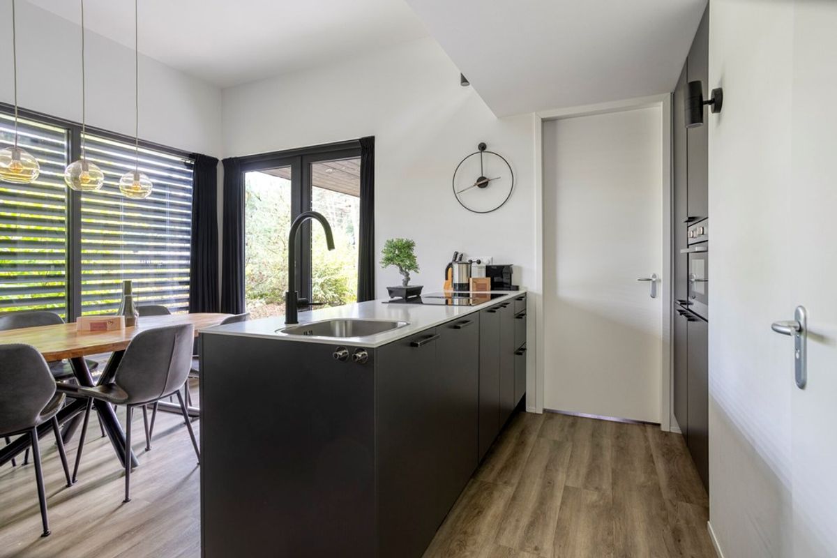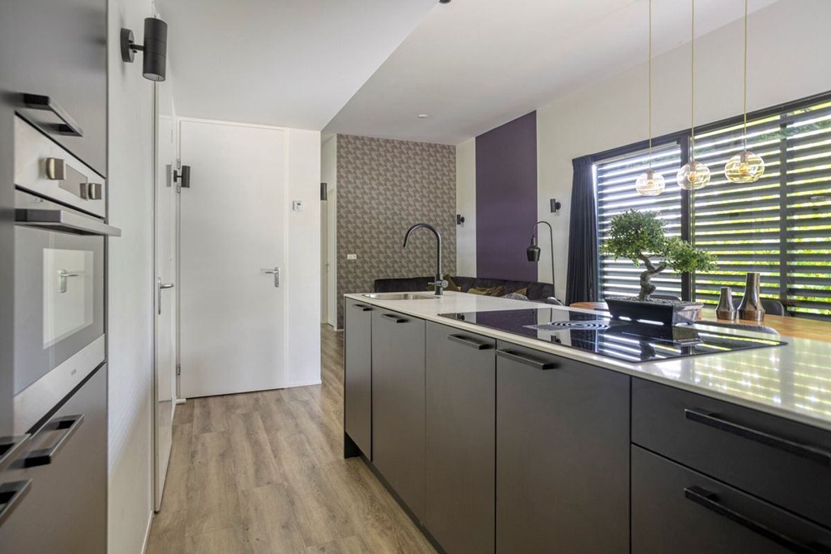 Aangrenzend aan de woonkamer bevindt zich de moderne keuken. Deze is uitgevoerd met een praktisch kookeiland en hoogwaardige inbouwapparatuur, waaronder een inductiekookplaat met geïntegreerde afzuiging en een oven. De strakke, eigentijdse afwerking zorgt voor een luxe uitstraling en maakt de keuken tot een fijne plek om te koken.