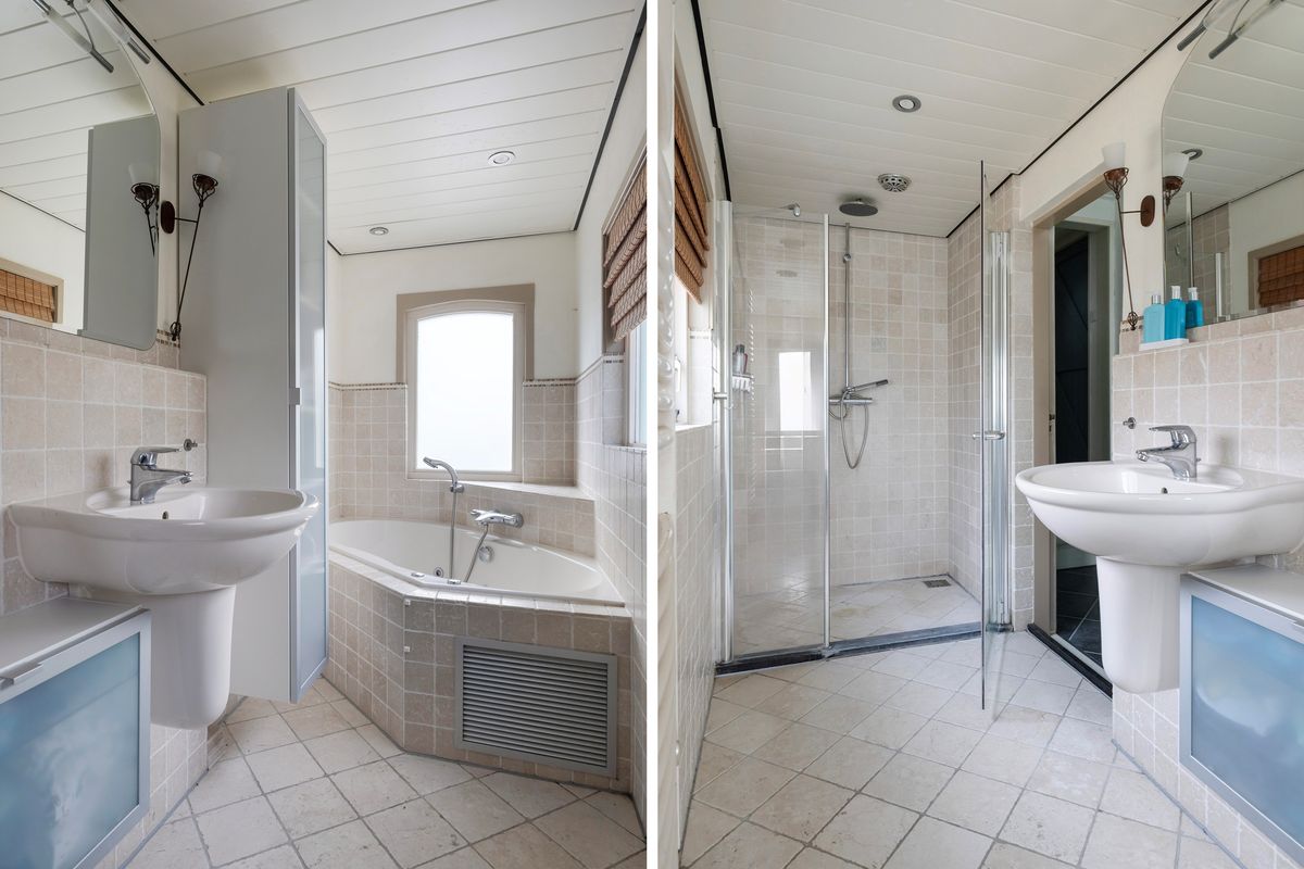 De entree van de woning is ruim en stijlvol en geeft toegang tot meerdere vertrekken. Links bevindt zich de badkamer met hoekbad, douche en wastafel – een plek om even helemaal te ontspannen. Verder vind je in de hal twee praktische inbouwkasten en een separaat toilet met hangend closet, urinoir en fonteintje.