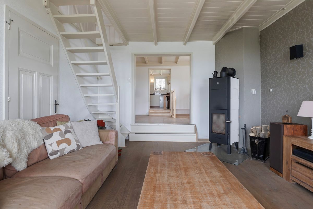 De sfeervolle opkamer, bereikbaar vanuit de hal, nodigt uit tot lezen, werken of gewoon genieten van het uitzicht. Vanuit hier leidt een trap naar het souterrain. Aan de voorzijde ligt de woonkamer met grote ramen en een schitterend vrij uitzicht. De houtkachel zorgt voor extra warmte en sfeer tijdens koude dagen. Aan de andere kant van de opkamer bevindt zich de royale woonkeuken – het hart van het huis – waar ruimte is voor koken, eten en gezellig samen zijn.