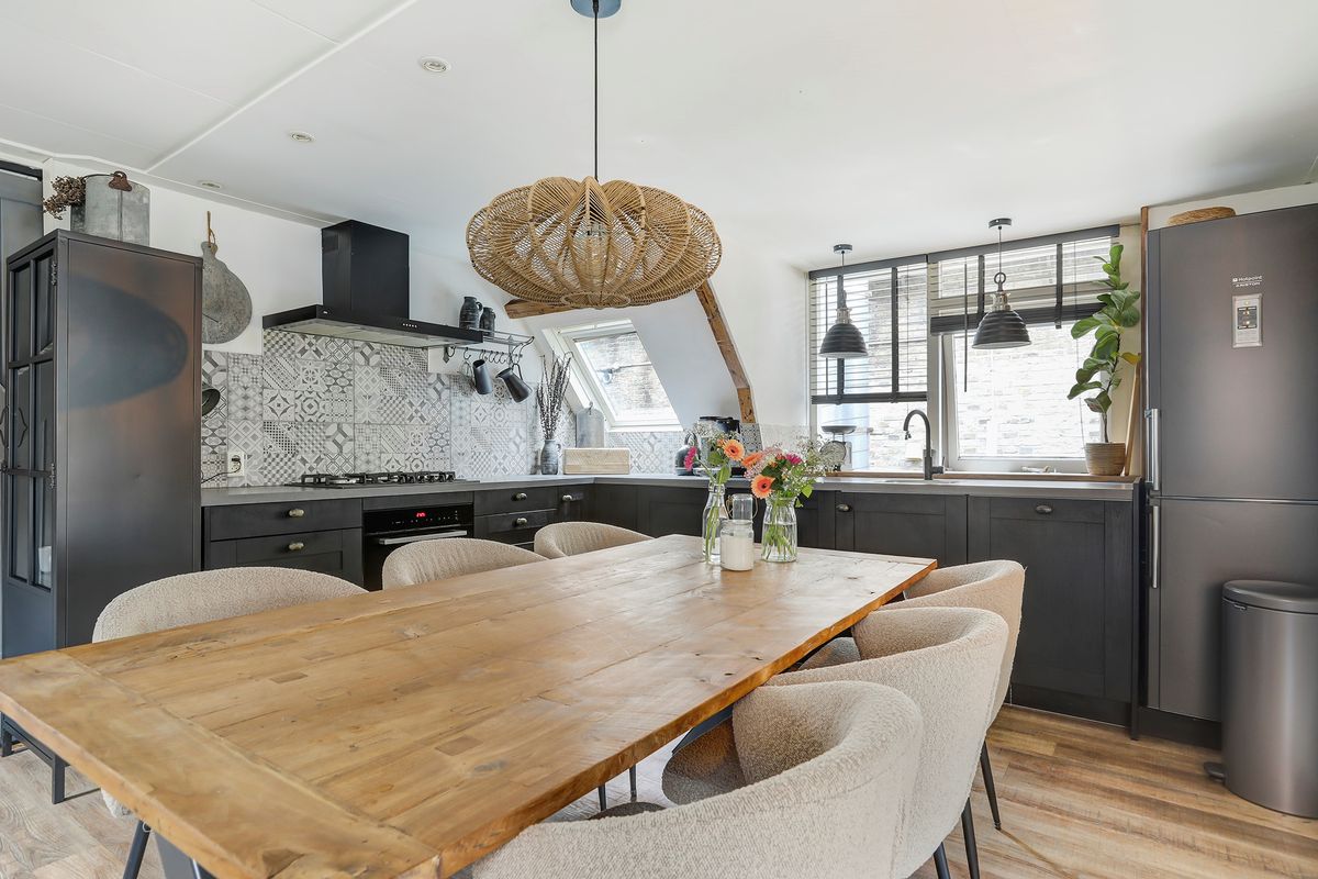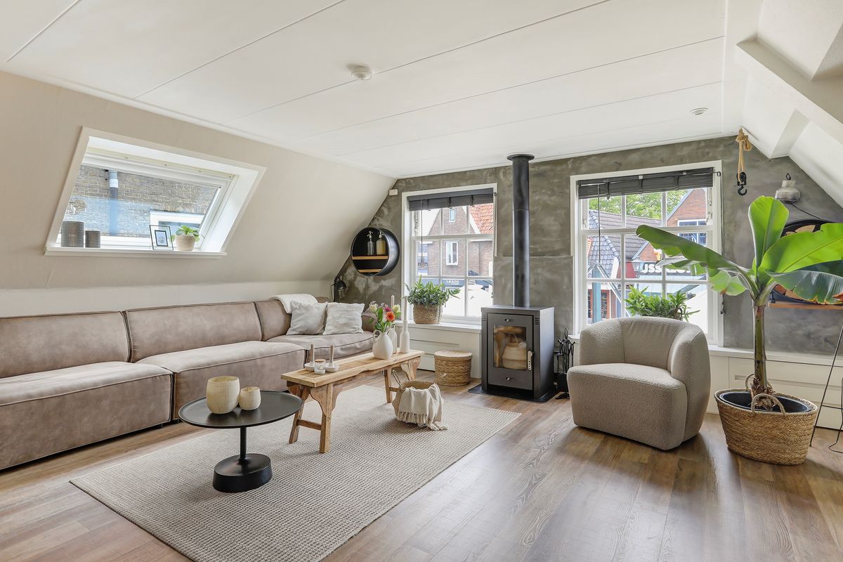 1e verdieping: trapopgang, deur naar de woonkamer met houtkachel en op meerdere plaatsen voorzien van dakramen. Ruime open keuken voorzien van diverse inbouwapparatuur zoals: 5-pits gasfornuis met afzuigkap, oven en vaatwasser. Via de keuken kom je in de hal. Badkamer met ligbad, wastafel en douchecabine, separaat toilet, 2 slaapkamers/kantoor. Aan de achterzijde van de woning is op het dakterras een uitbouw gerealiseerd, waarin zich een royale slaapkamer bevindt met een kamer en suite. Deze lichte ruimte beschikt over openslaande deuren naar het dakterras. De ensuite-kamer kan uitstekend dienen als inloopkast, werkruimte of zitkamer.