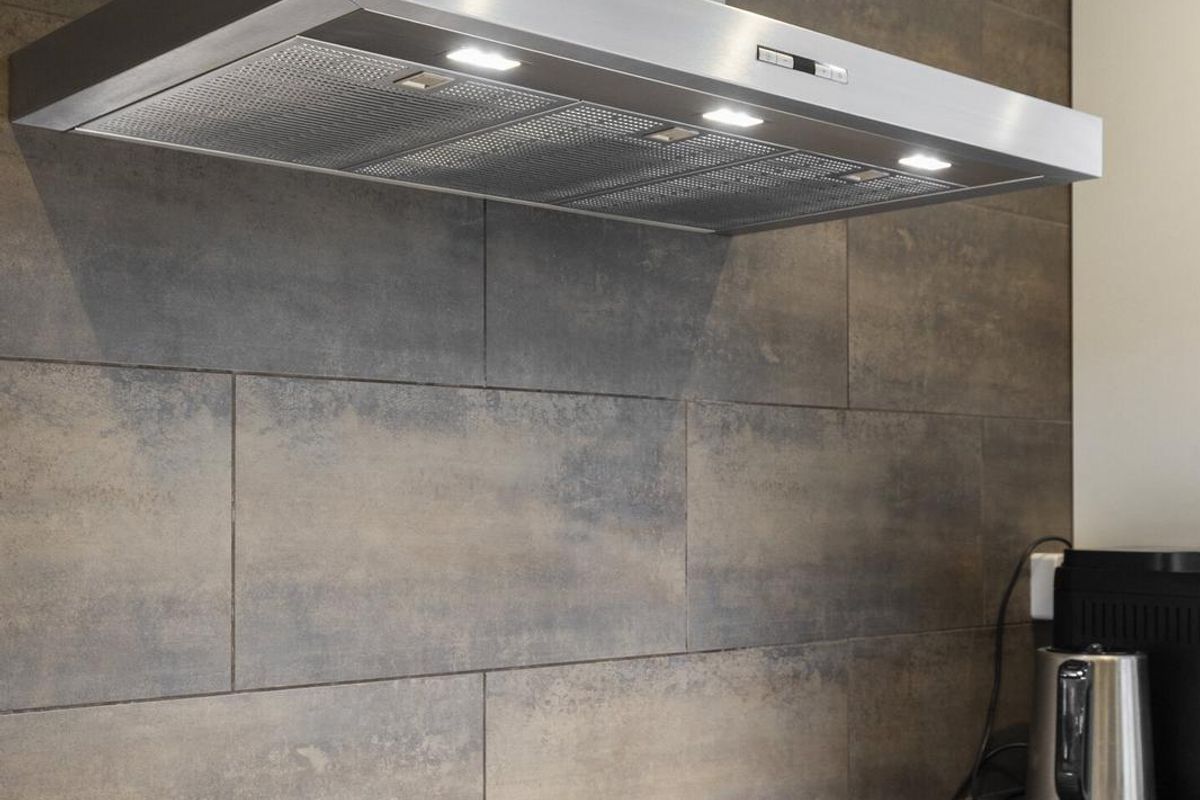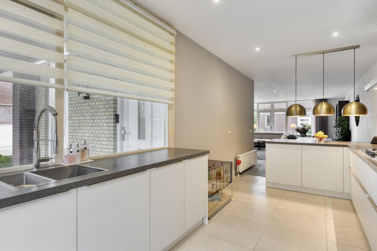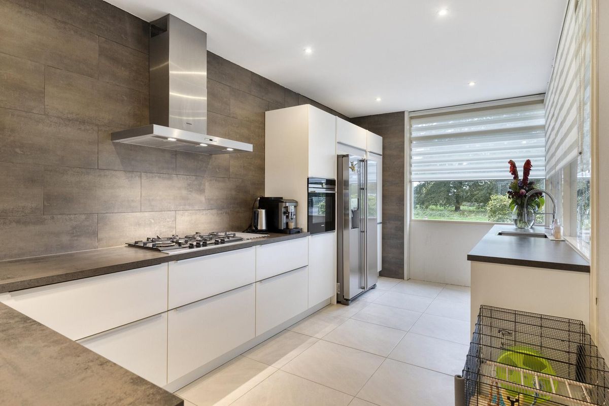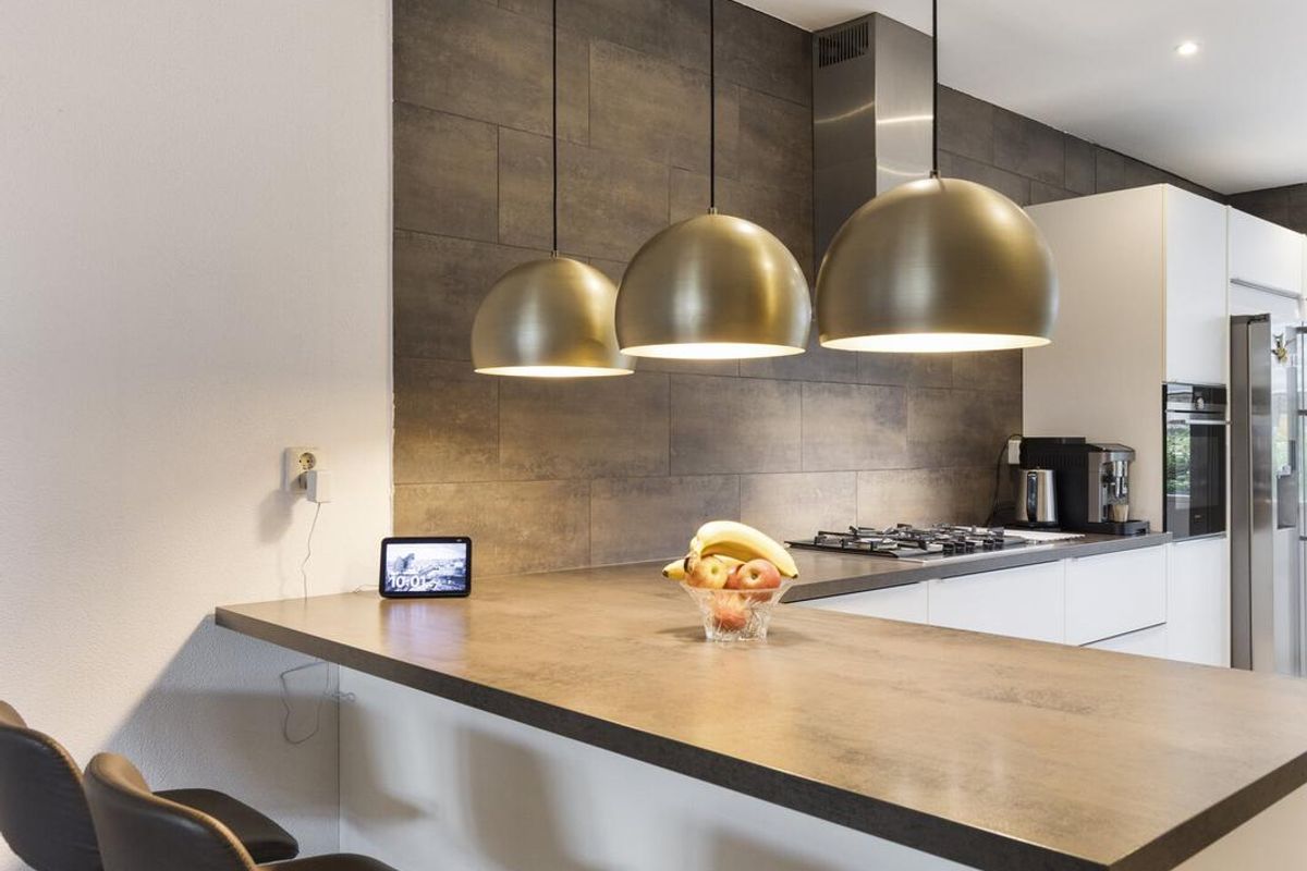 * Luxe keuken voorzien van moderne plavuizen vloer met vloerverwarming, eetbar, 5-pits gaskookplaat, RVS afzuigkap, oven, koel-/vriescombinatie en vaatwasser.