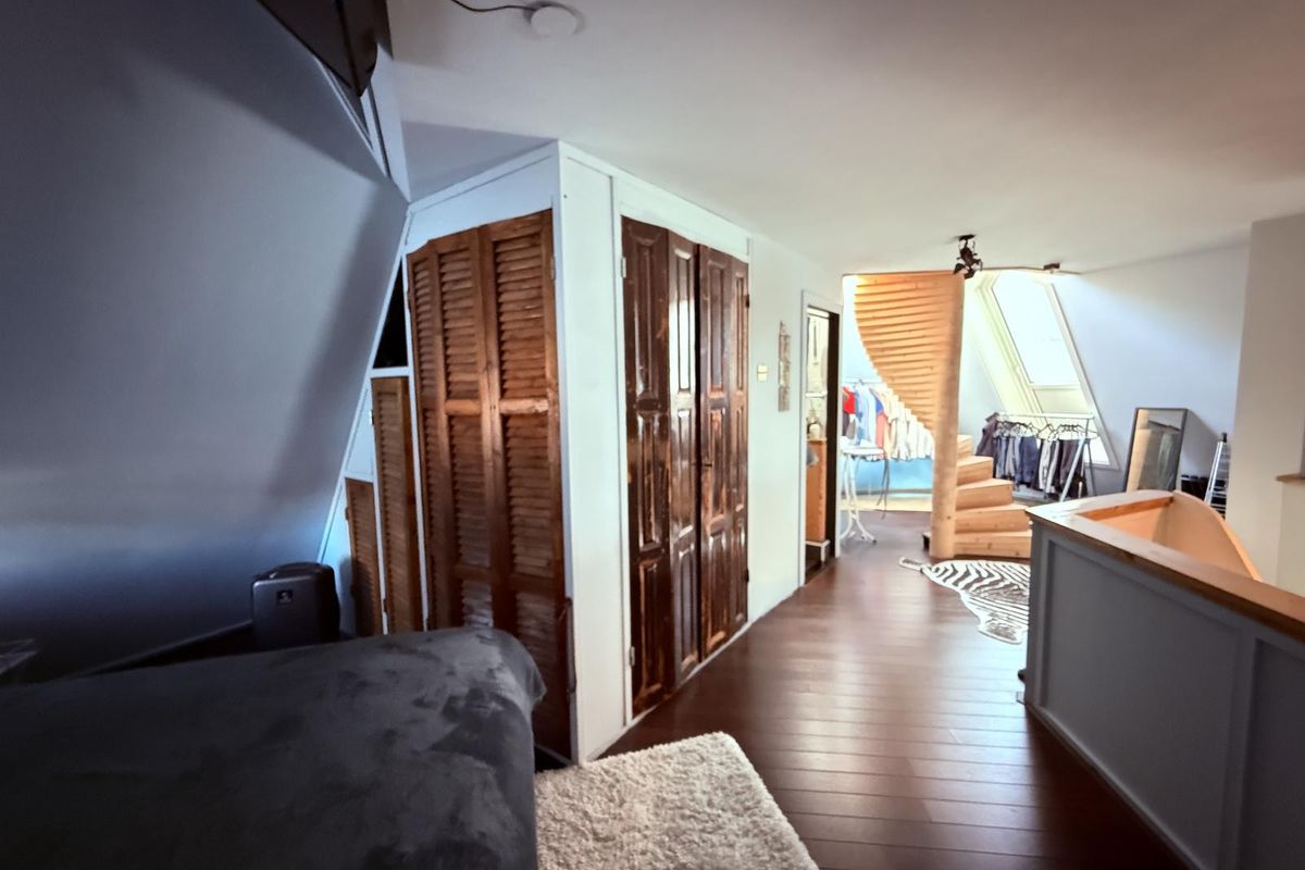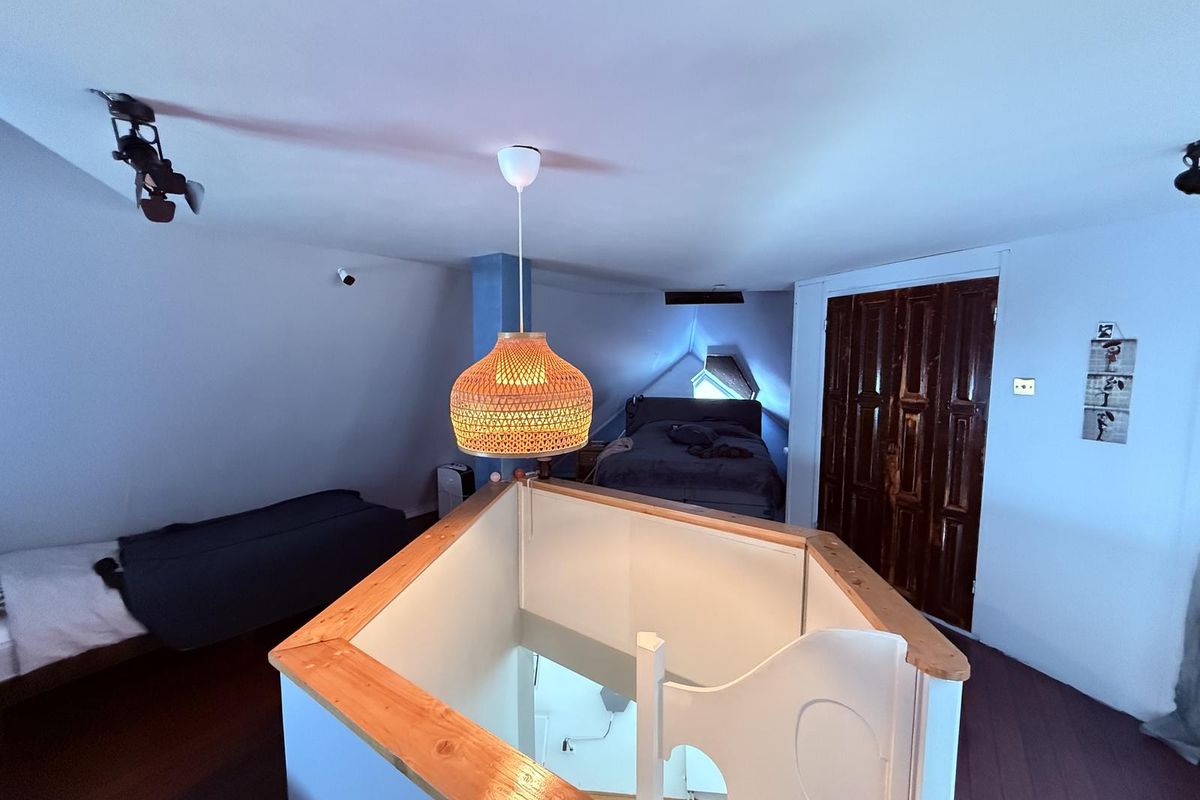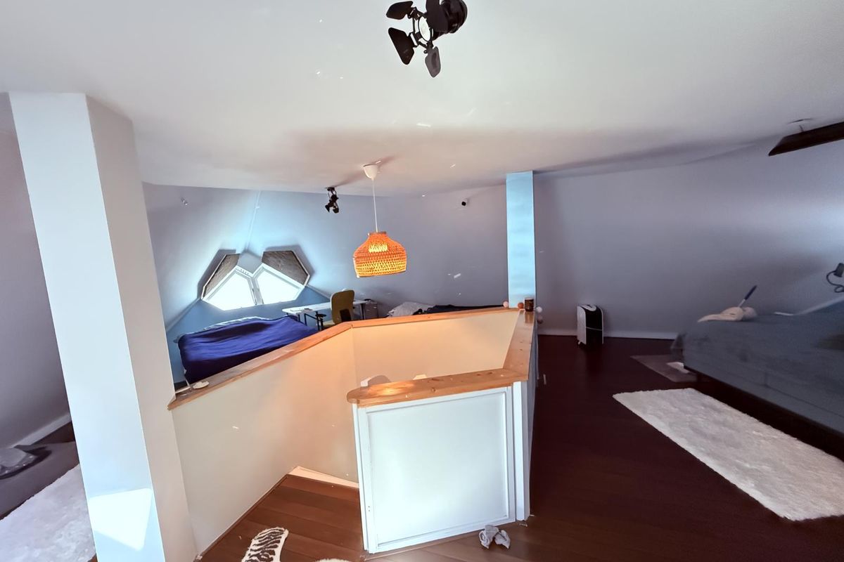 - Derde slaapkamer in de punt van de kubus, momenteel ingericht als kinderkamer. Dankzij de ramen rondom is deze ruimte ook perfect als atelier of werkkamer. Het uitzicht is adembenemend – hier slaapt u onder de sterren, midden in de stad.