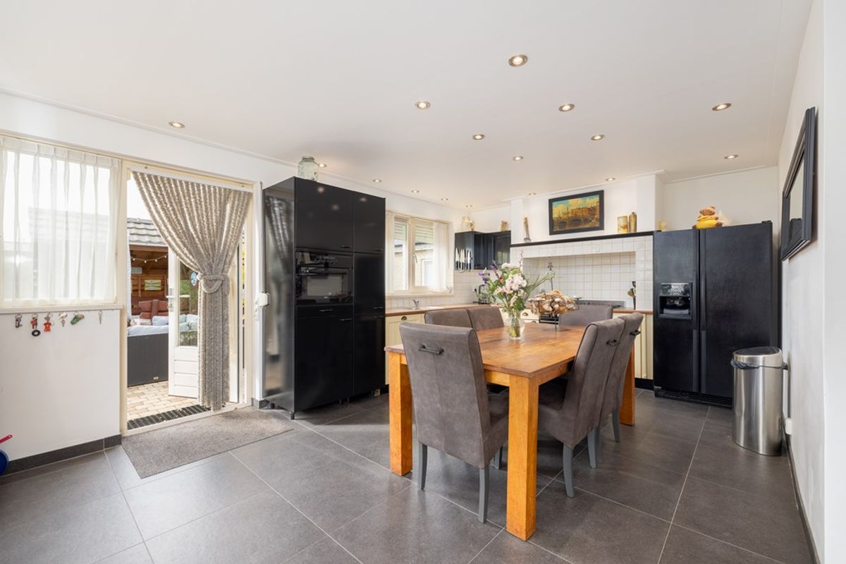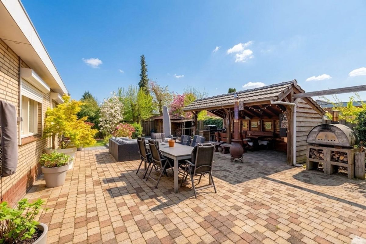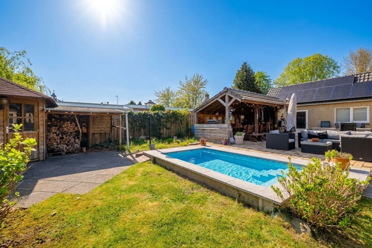 De achtertuin vormt zonder twijfel het absolute hoogtepunt van deze woning. Centraal ligt een helderblauw zwembad, omringd door een stijlvol aangelegd terras waar een royale loungeset en een sfeervolle houten overkapping met geïntegreerde verlichting uitnodigen tot lange, ontspannen zomeravonden.