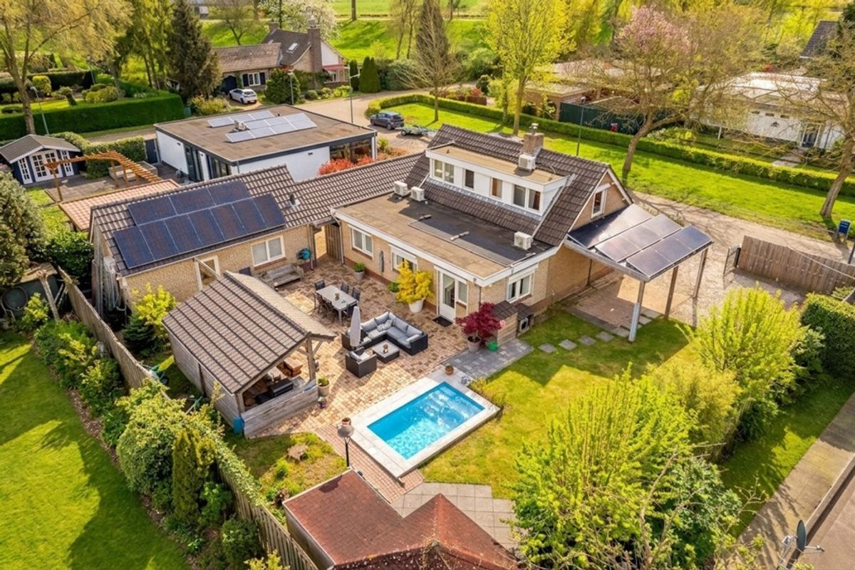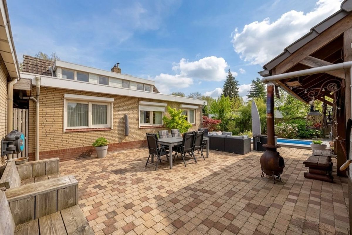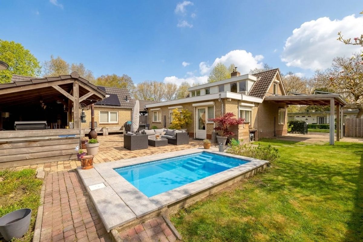 Aan de buitenzijde presenteert de woning zich verzorgd en tijdloos, uitgevoerd in baksteen onder een klassiek pannendak en fraai gelegen aan een rustig, groen plantsoen. De ruime oprit biedt plaats aan meerdere voertuigen en leidt naar een indrukwekkende carport, een robuuste houten overkapping met authentieke kapconstructie, die naadloos overgaat in de garage. Aan de achterzijde aan het zwembad bevindt zich een sfeervolle veranda, ingericht als volwaardig poolhouse met loungegedeelte en buitenkeuken. Hier komt binnen en buiten moeiteloos samen en geniet u in alle rust en privacy.
