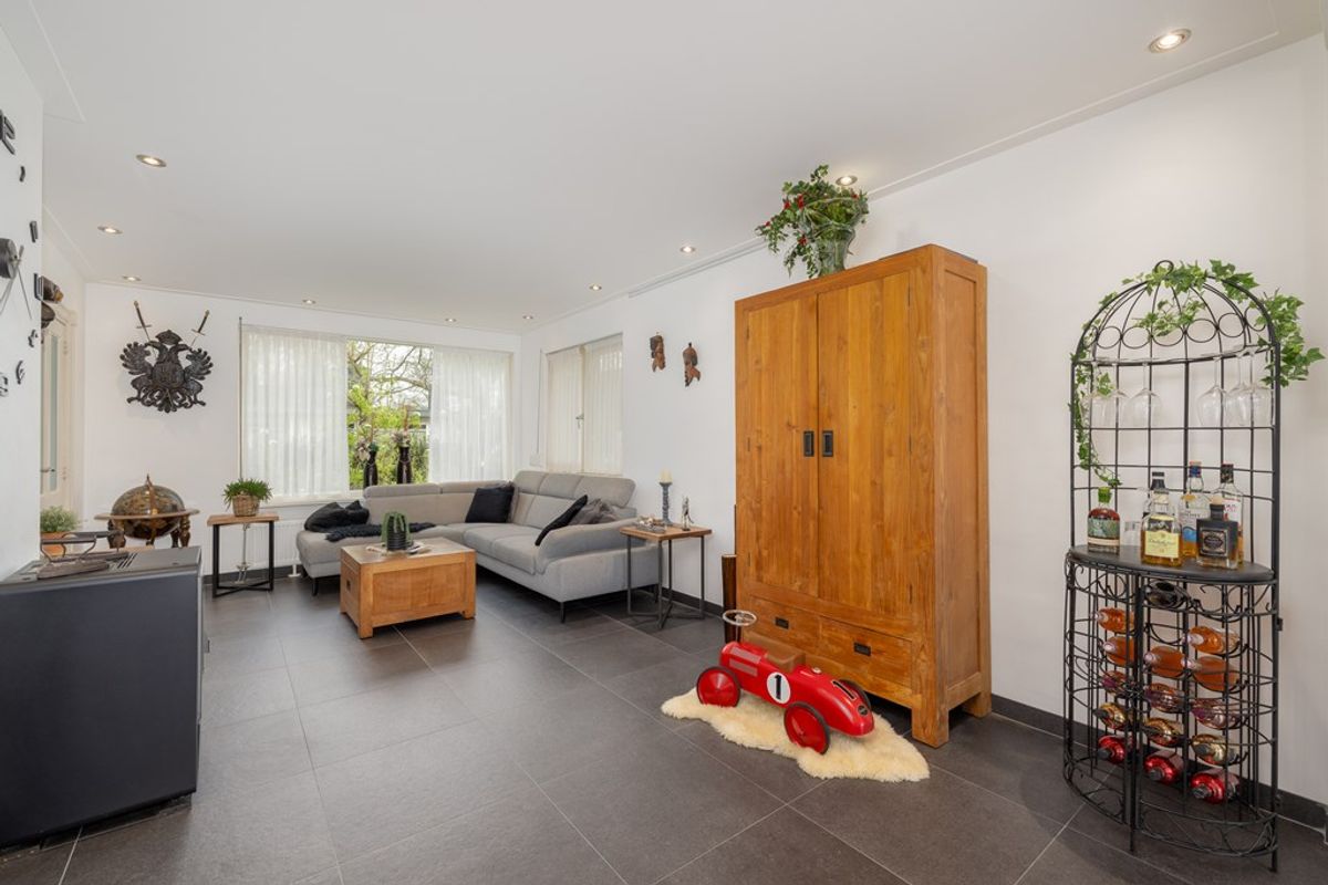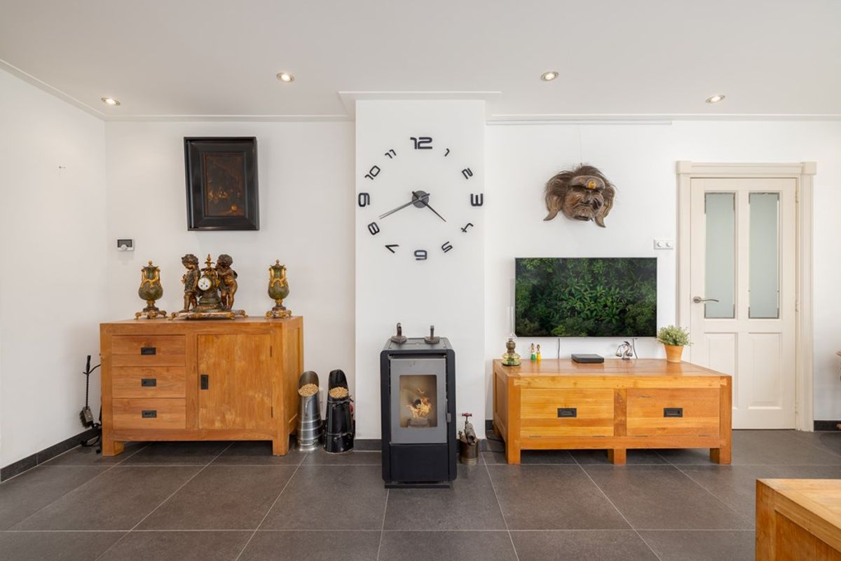 Bij binnenkomst wordt u direct verrast door de lichte, sfeervolle en royaal opgezette woonkamer. Grote raampartijen bieden een fraai uitzicht op het omliggende groen, waaronder het plantsoen en de tuinen, en zorgen voor een prachtige lichtinval gedurende de dag. De ruimte is afgewerkt met stijlvolle antracietkleurige plavuizen voorzien van vloerverwarming en airconditioning, inbouwspots en een pelletkachel, wat samen zorgt voor een warme, comfortabele en eigentijdse leefomgeving.