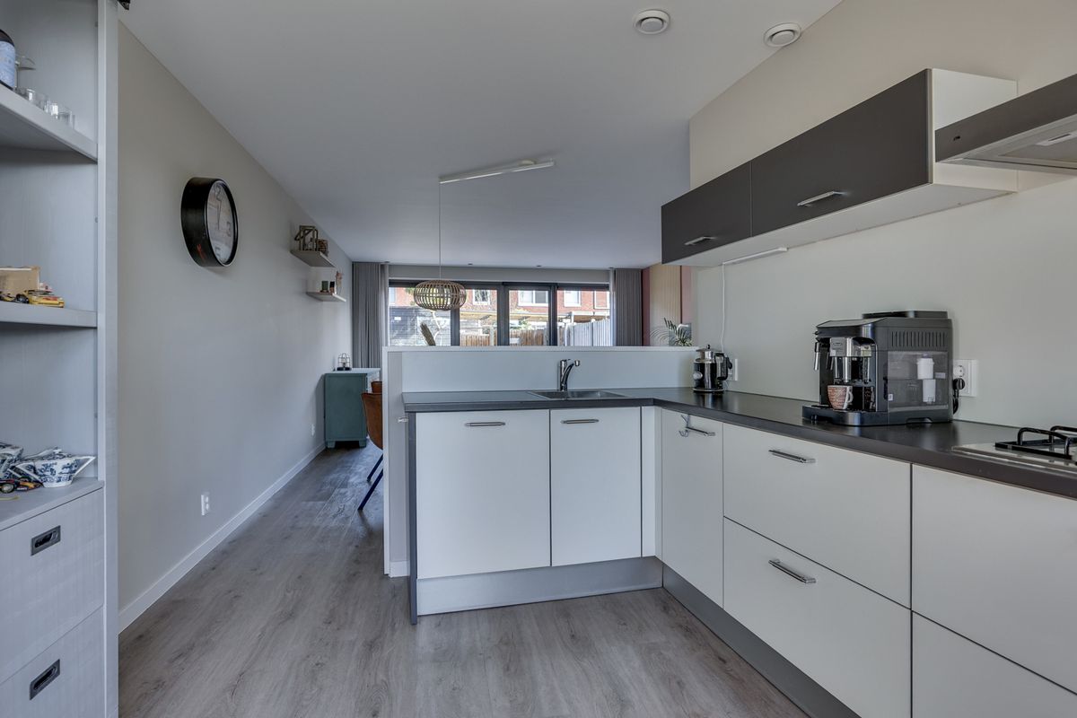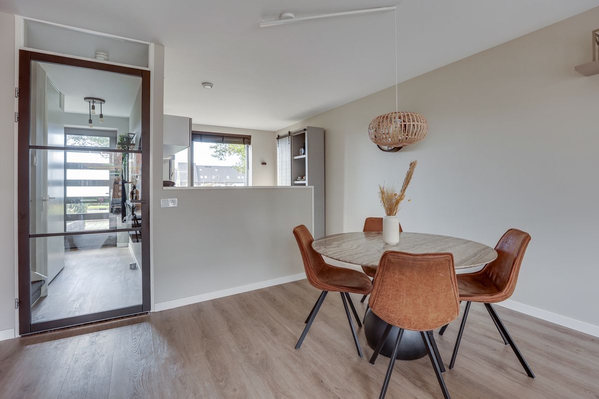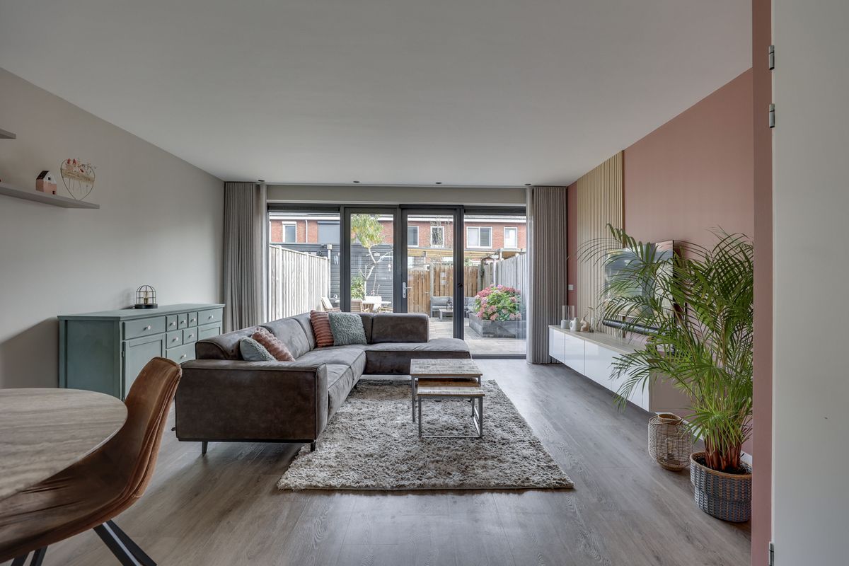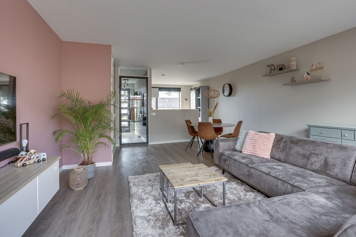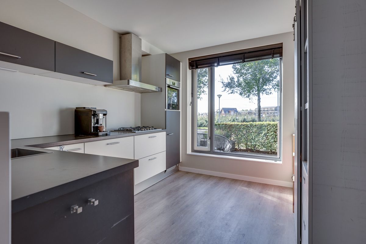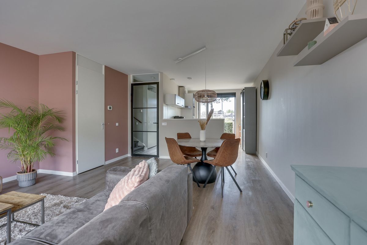 De tuingerichte en uitgebouwde woonkamer heeft dubbele openslaande deuren naar de achtertuin. Aan de voorzijde bevindt zich de moderne keuken met inbouwapparatuur. De begane grond is voorzien van een pvc-vloer met vloerverwarming.