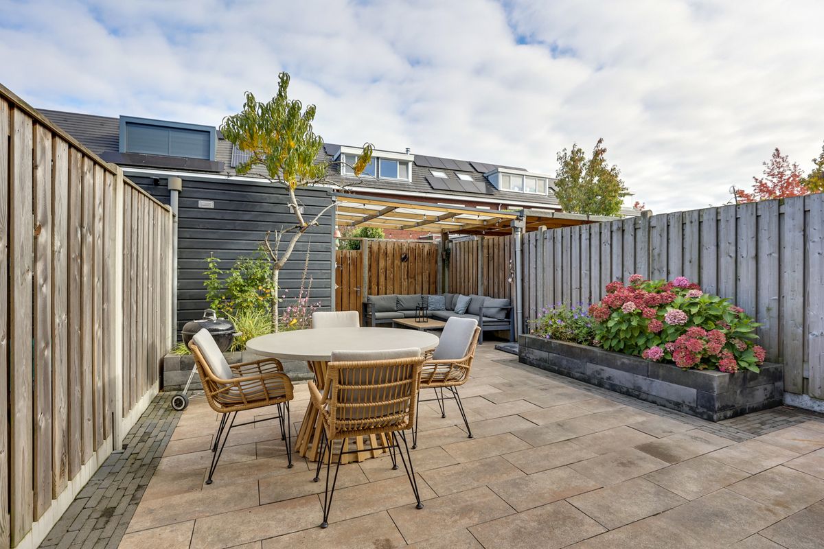 De onderhoudsvriendelijke achtertuin is een heerlijke plek om te ontspannen, te genieten van het zonnetje of gezellig te borrelen onder de aangebouwde veranda bij de vrijstaande berging. De voortuin biedt een prettige buffer tussen de woning en de straat, waardoor je privacy hebt en het geheel een verzorgde uitstraling krijgt.