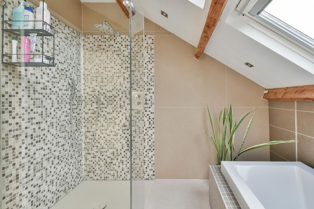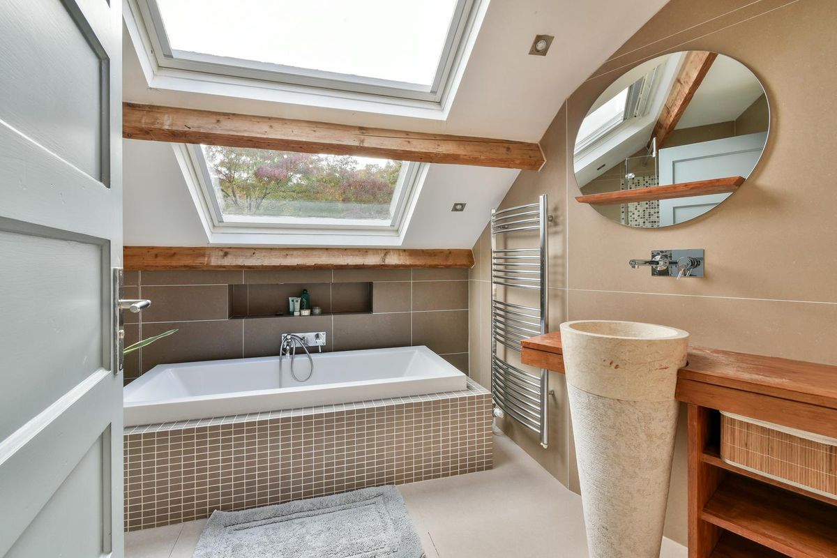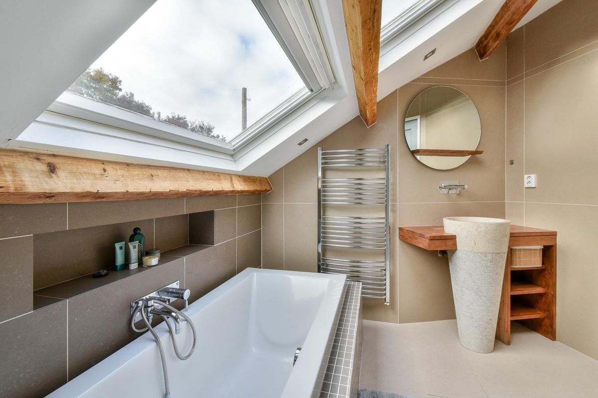 Stairs in the hall lead to the third floor. Landing with separate toilet and access to the sunny and sheltered roof terrace. Master bedroom with large walk-in wardrobe and cupboard space under the sloping roof. Sliding doors give access to the roof terrace and offer beautiful views of the greenery. This floor also has a practical room with connections for a washing machine and dryer. Luxurious bathroom with washbasin with cabinet, walk-in shower, bathtub and 2 skylights.