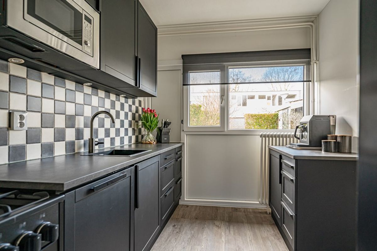 Aan de voorzijde bevindt zich een aparte eetkamer. De halfopen keuken aan de voorzijde is netjes uitgevoerd en voorzien van onder- en bovenkasten, vaatwasser, magnetron en spoelbak. De grote 5-pits gaskookplaat met geïntegreerde oven is ter overname. Vanuit de keuken is er toegang tot een praktische trapkast.