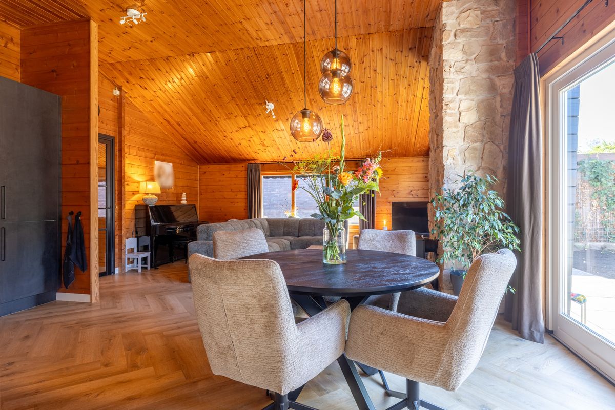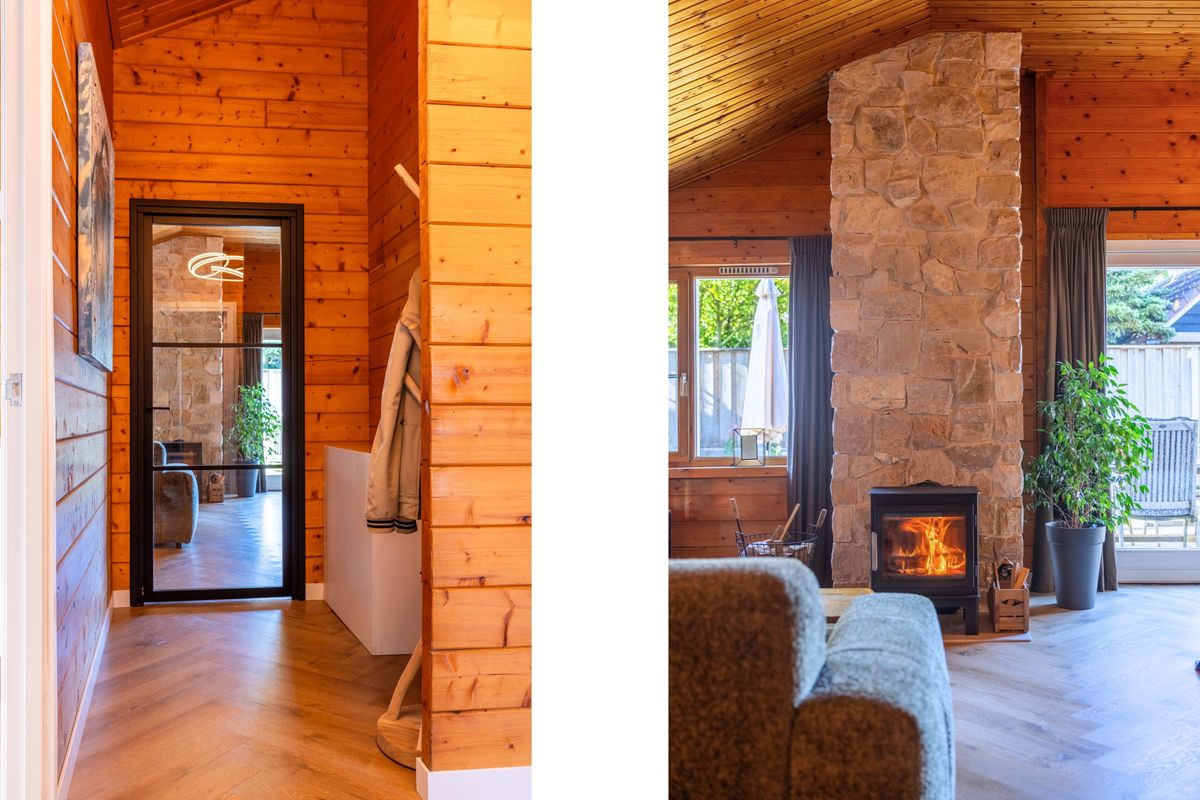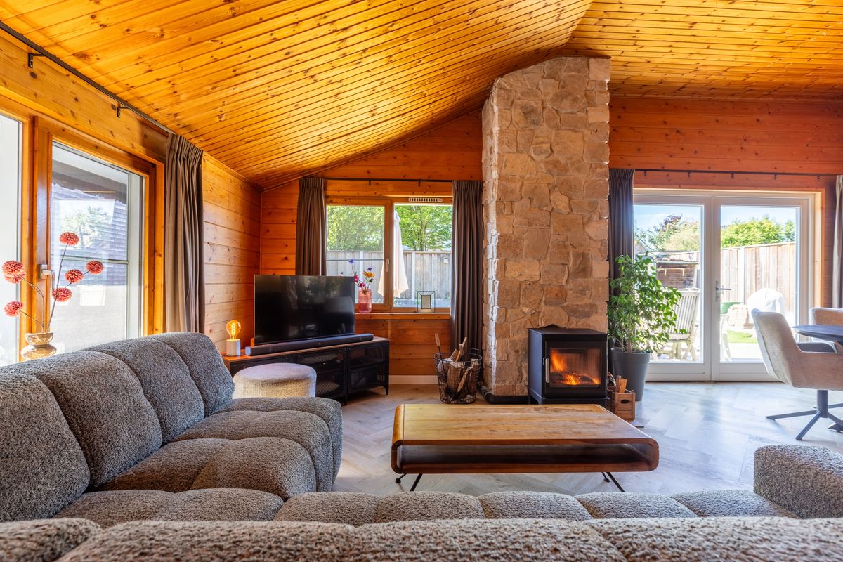 De natuurlijke uitstraling van de houten woning sluit perfect aan bij de omgeving, waardoor binnen en buiten naadloos in elkaar overlopen.