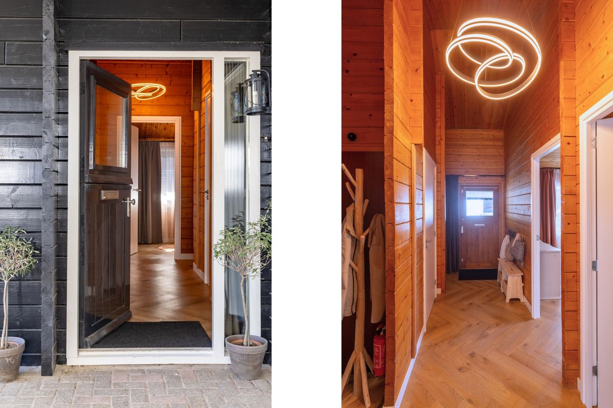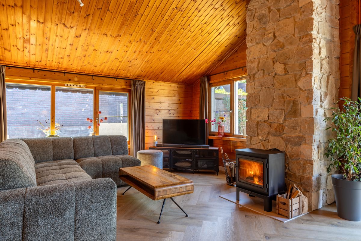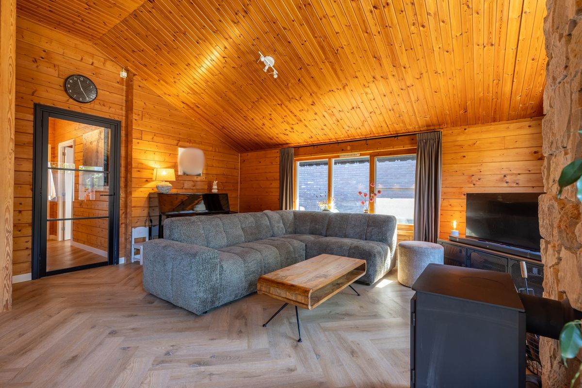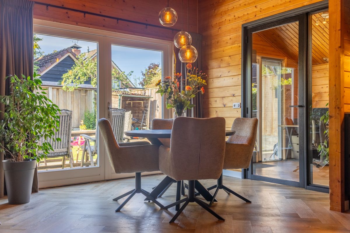 De natuurlijke uitstraling van de houten woning sluit perfect aan bij de omgeving, waardoor binnen en buiten naadloos in elkaar overlopen.