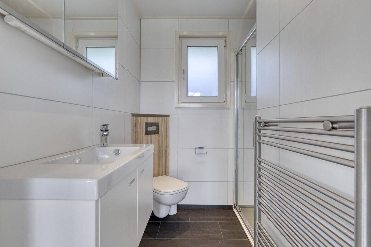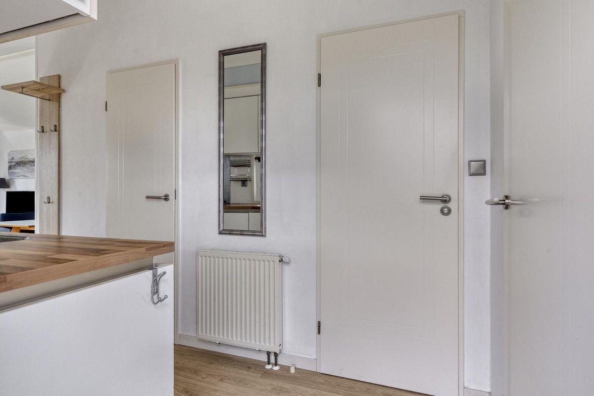 Via de entree komt u in de hal die toegang biedt tot de in lichte kleuren betegelde badkamer, uitgerust met een wandcloset, douchecabine, spiegelkast en een modern wastafelmeubel. De woning beschikt over twee comfortabele slaapkamers. De hoofdslaapkamer is voorzien van een ruime kastenwand met schuifdeuren. De tweede slaapkamer, gelegen direct daarnaast, is ideaal als kinderkamer, werkkamer of logeerkamer.