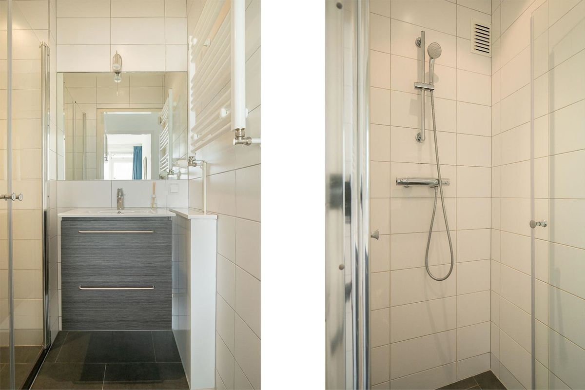 De badkamer is afgewerkt met witte wandtegels, antracietkleurige vloertegels, een inloopdouche met glazen klapdeuren, een wastafelmeubel, geïntegreerde spiegel en een handdoekradiator.