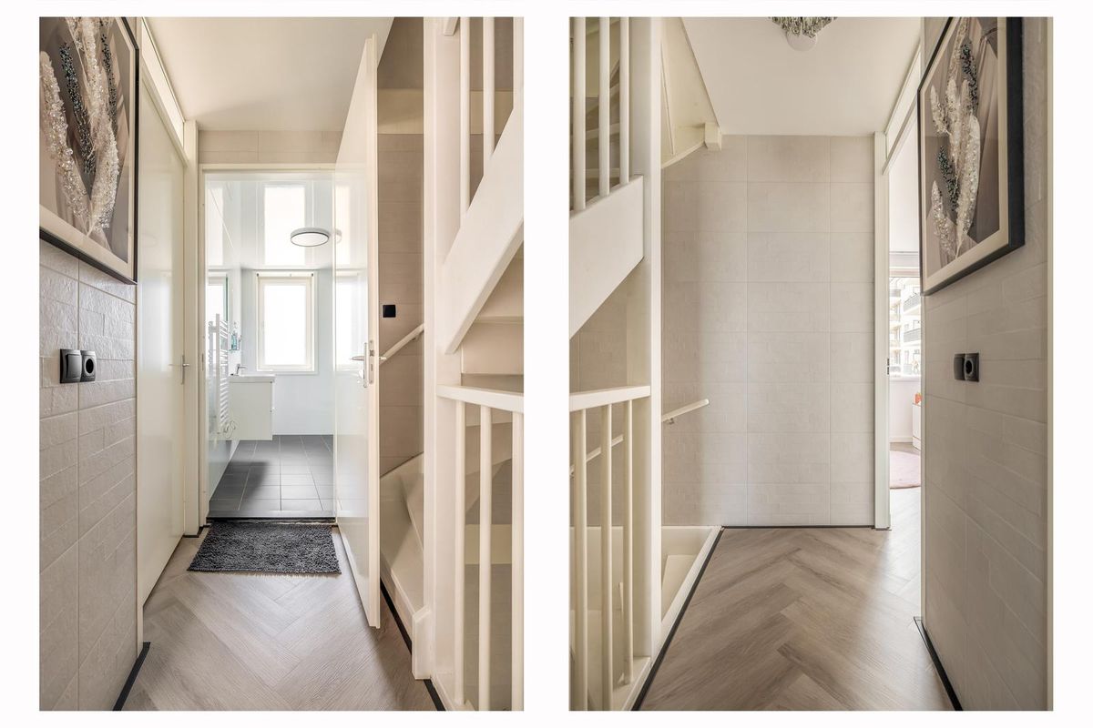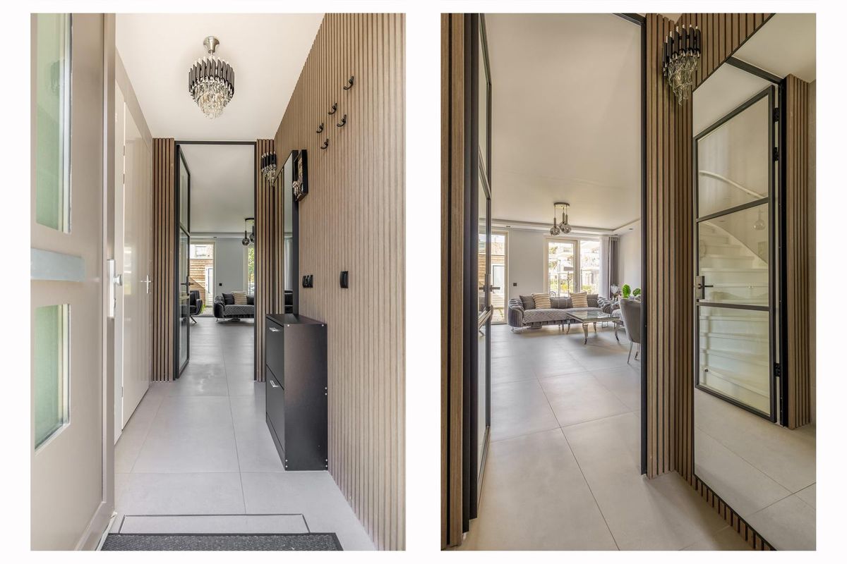 Bij binnenkomst van deze moderne woning stap in de ruime, verzorgde hal. Hier proeft u gelijk de sfeer en het moderne afwerkingsniveau van de hele woning. De hal is voorzien van het toilet met fonteintje, de meterkast en een vaste kast met de opstelling van de warmtepomp.