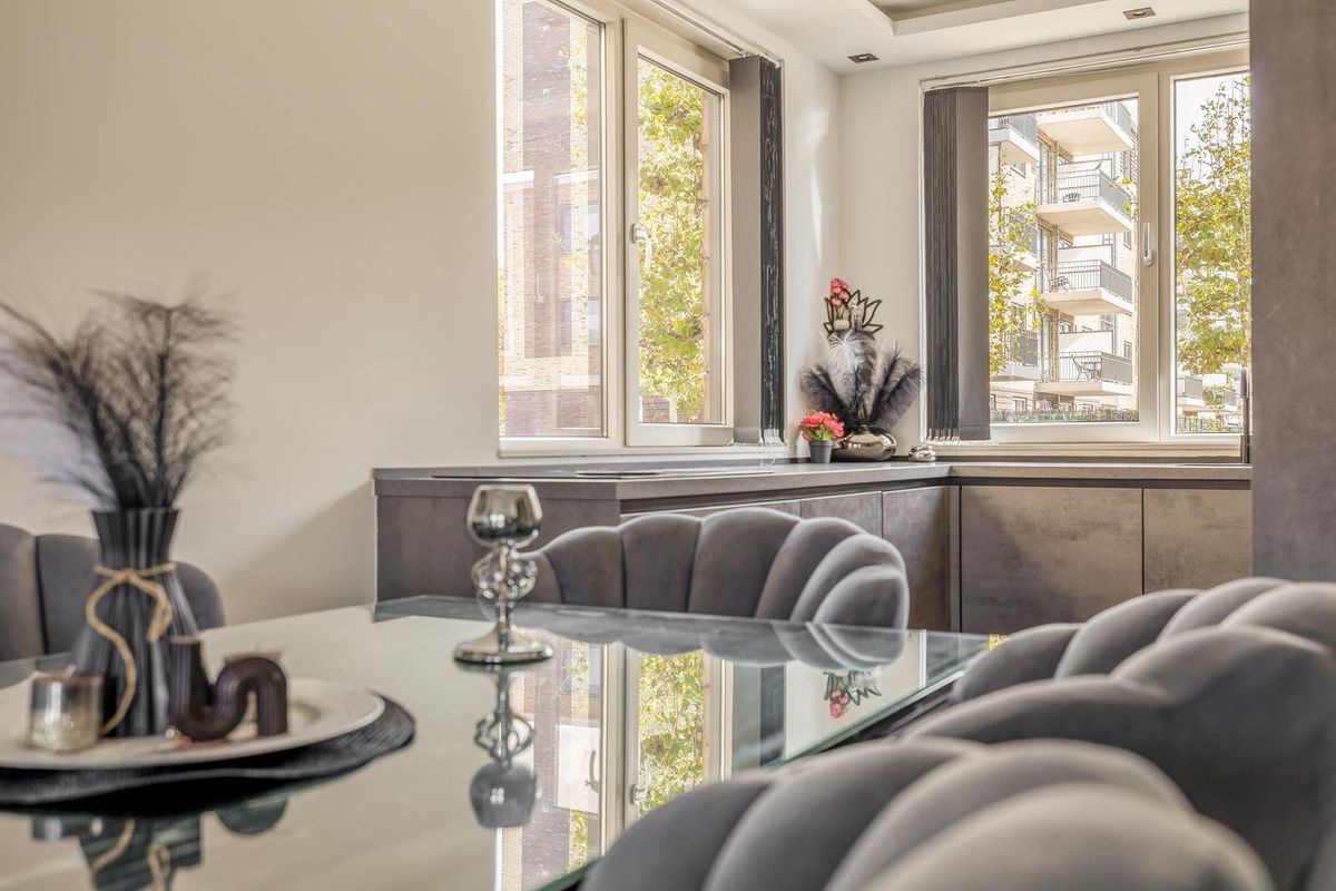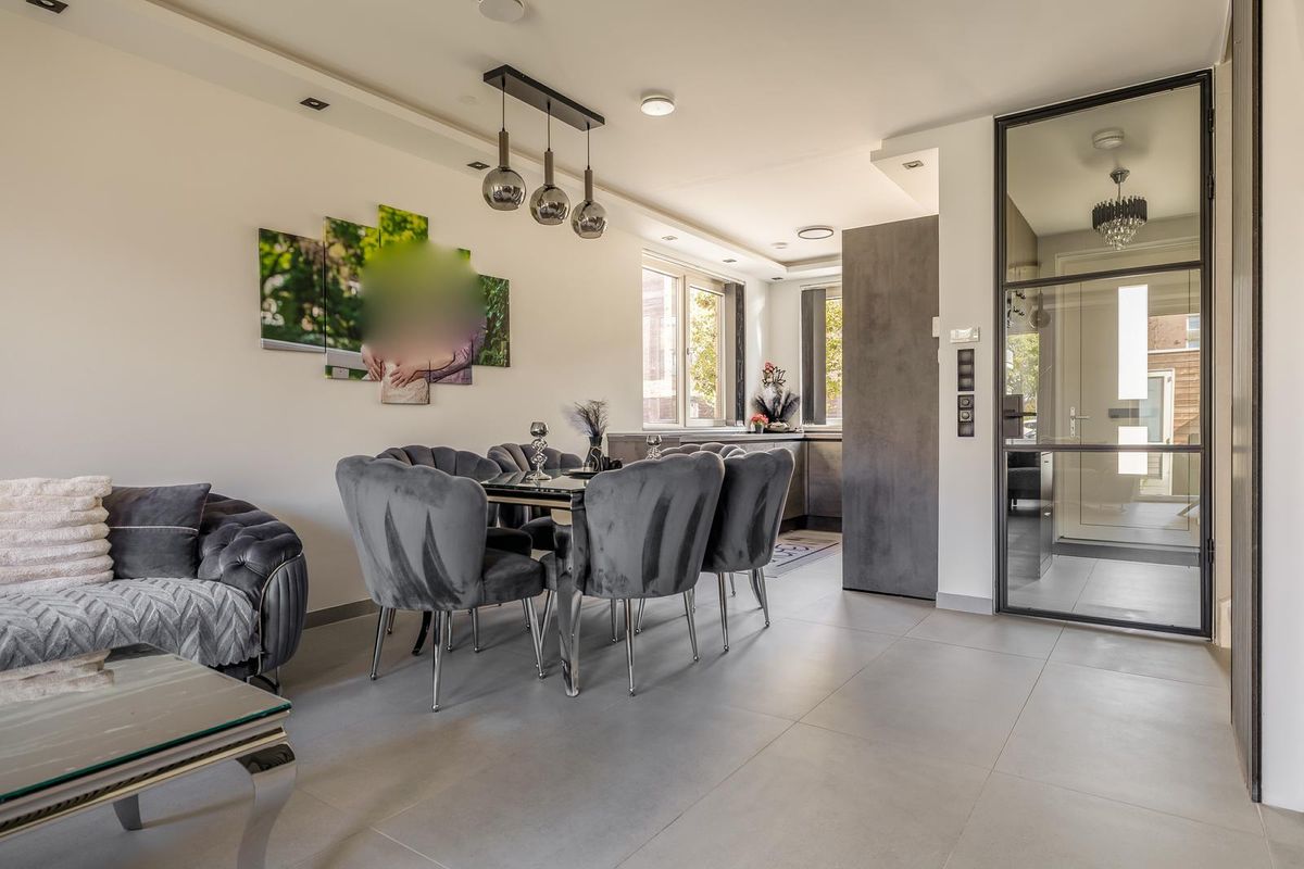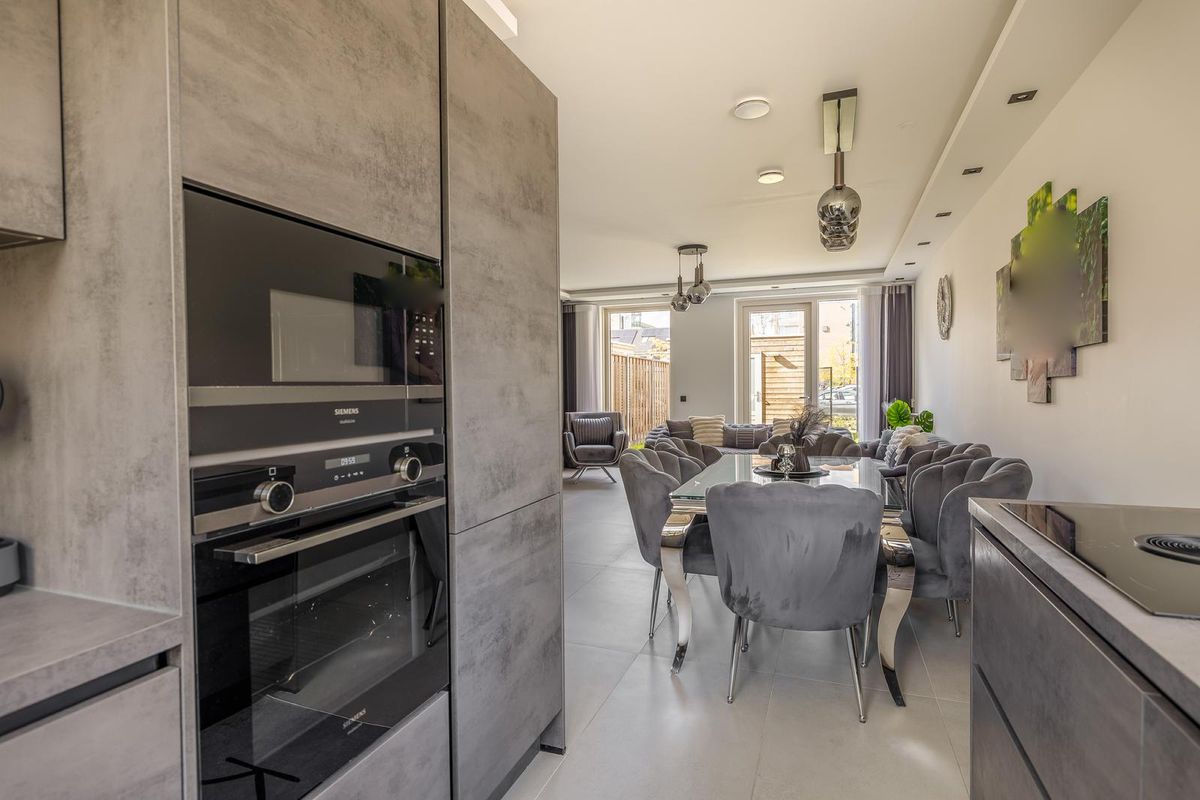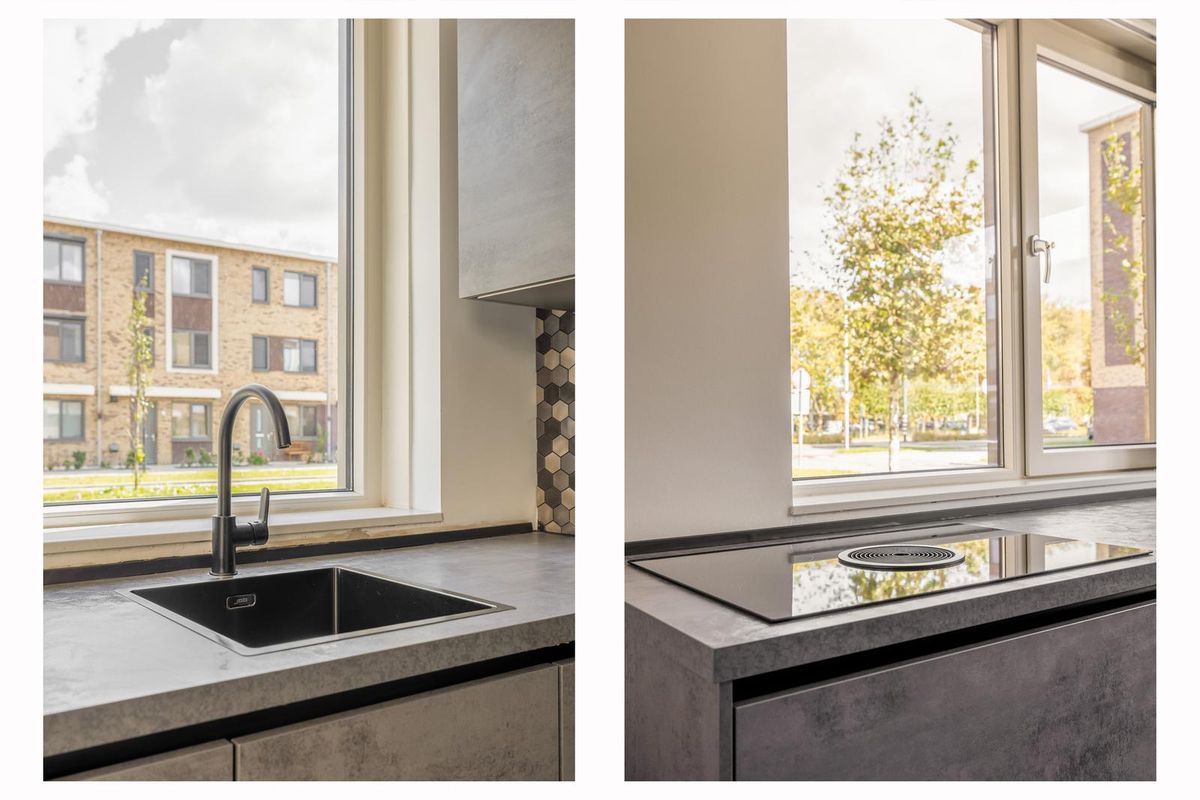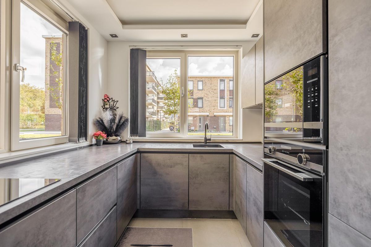 De moderne keuken aan de voorzijde van het huis beschikt over vier ramen waardoor je uitzicht op de straat heb tijdens het koken en waardoor er veel natuurlijk licht naar binnen komt. Naast voldoende werkblad en kastruimte bestaat de keuken onder andere uit een Bora inductie kookplaat met downdraftafzuiging, oven, magnetron, koel-/vriescombinatie en een vaatwasmachine.