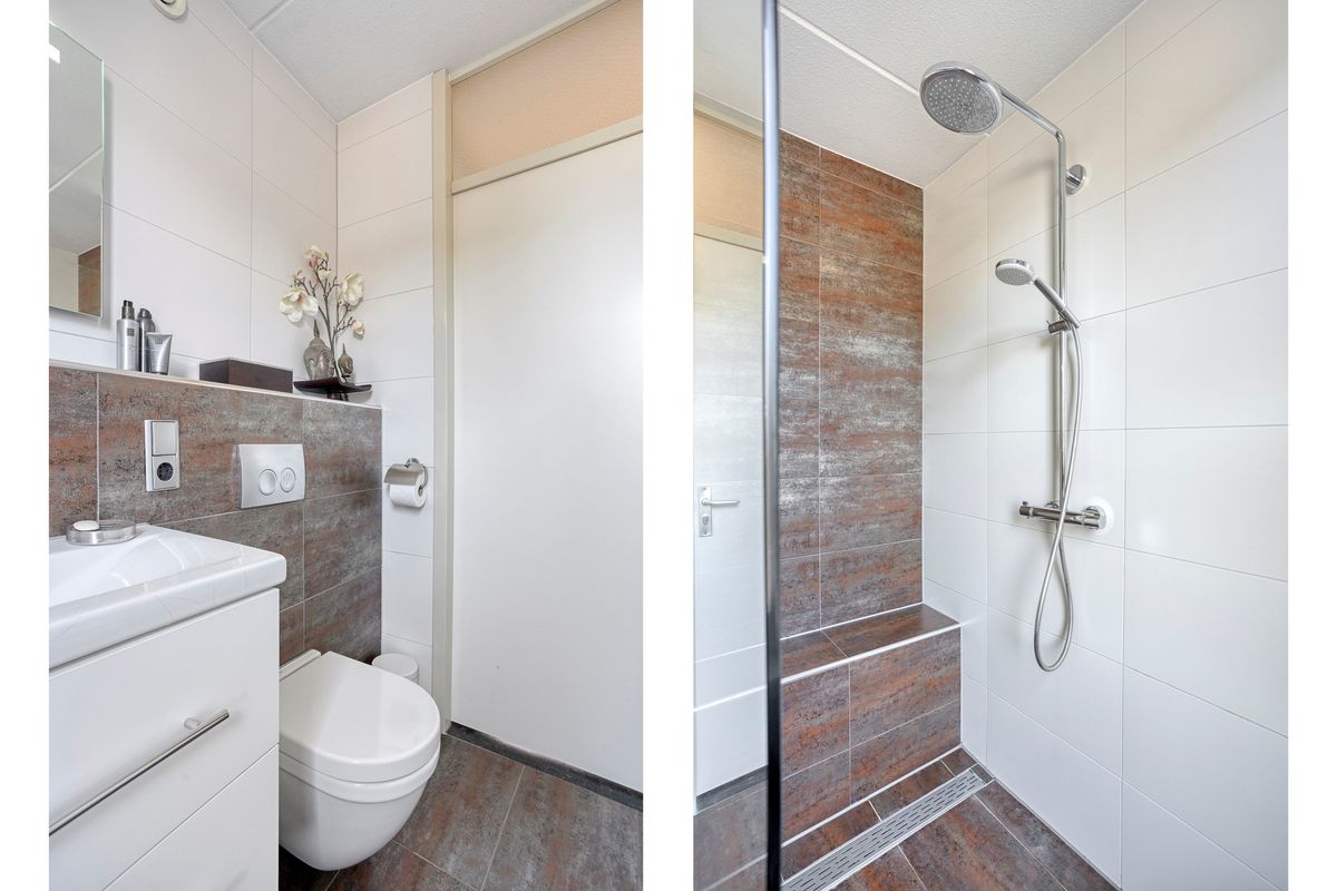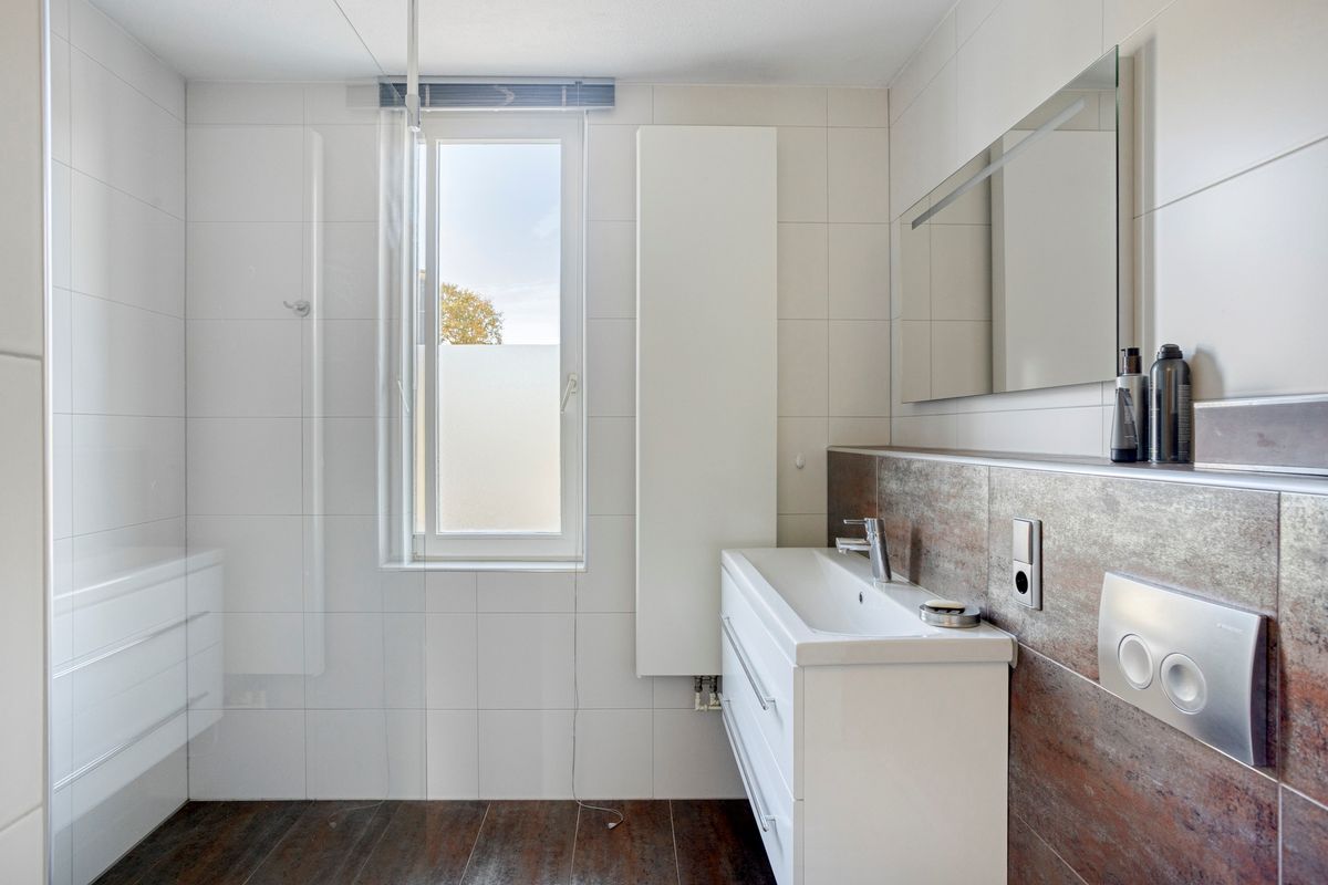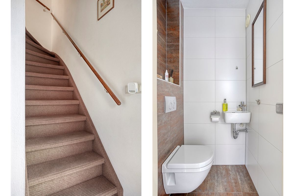 Verdieping: overloop naar 2 (oorspronkelijk 3) slaapkamers (waarvan 1 met airco); badkamer met inloopdouche, 2e toilet en wastafelmeubel.