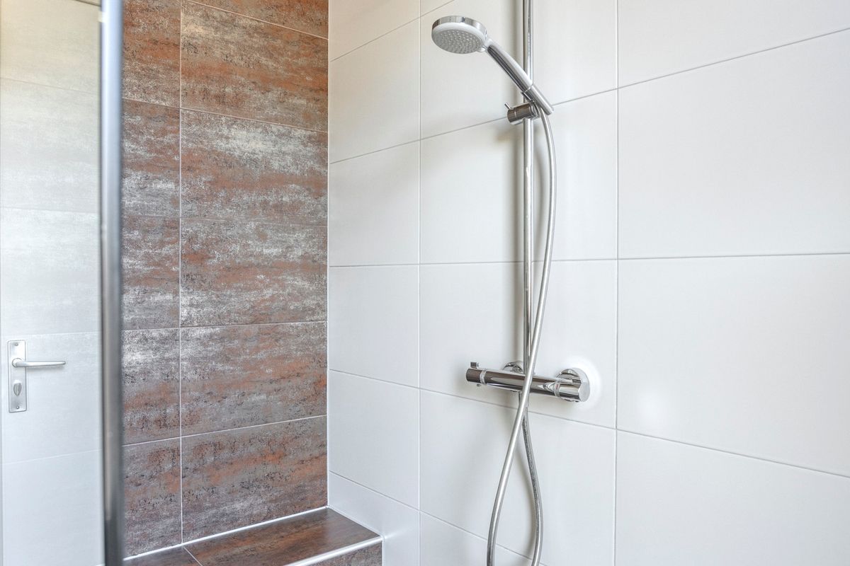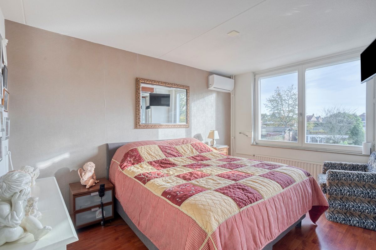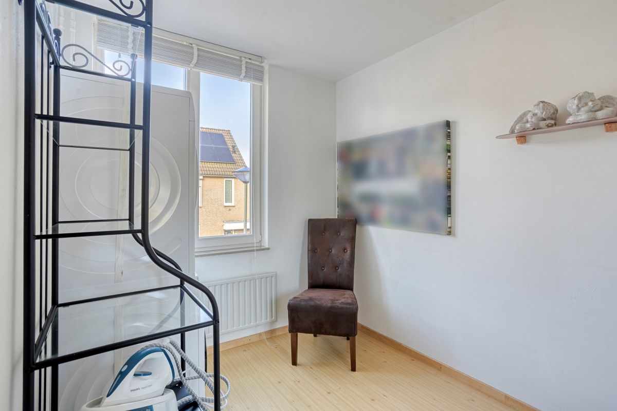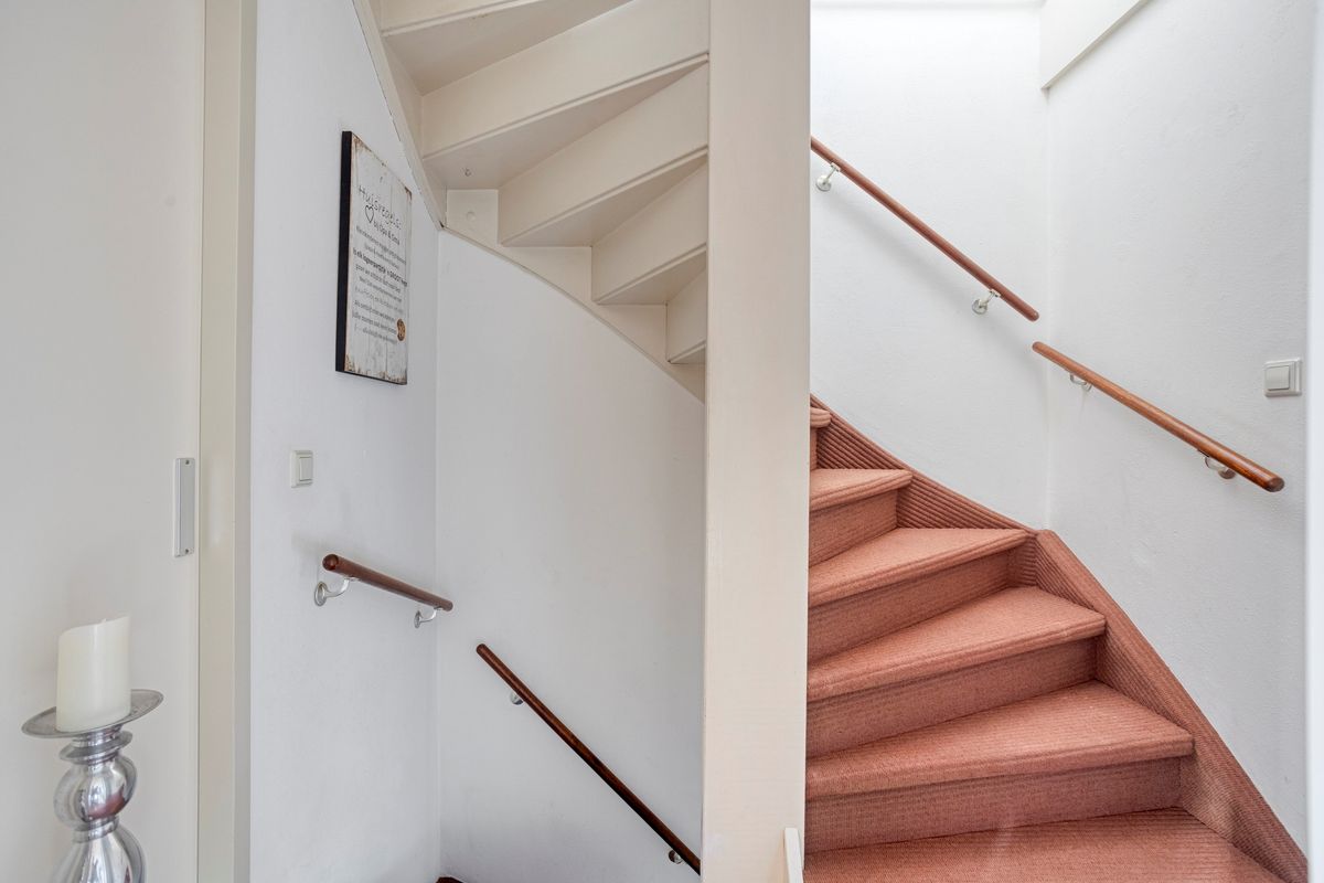 Verdieping: overloop naar 2 (oorspronkelijk 3) slaapkamers (waarvan 1 met airco); badkamer met inloopdouche, 2e toilet en wastafelmeubel.