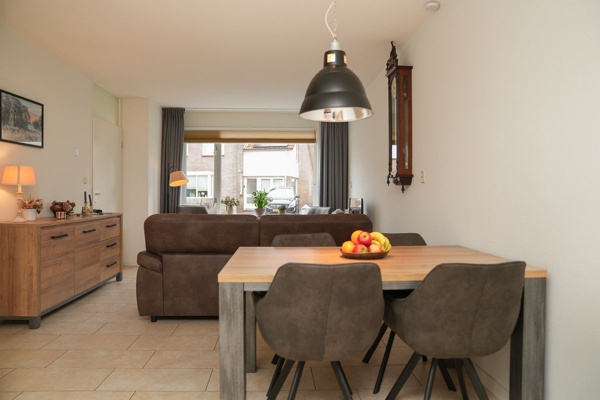 Aan de voorzijde ligt de gezellige woonkamer. Het grote raam zorgt voor een fijne lichtinval en een vrij uitzicht op de straat. Er is ruimte genoeg voor een eethoek tussen de zithoek en de keuken.